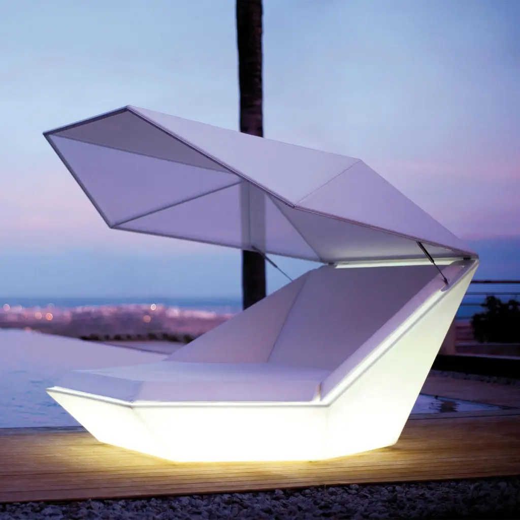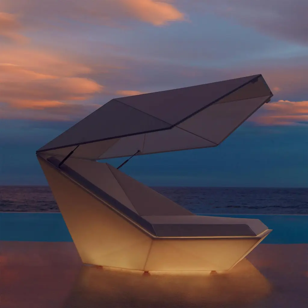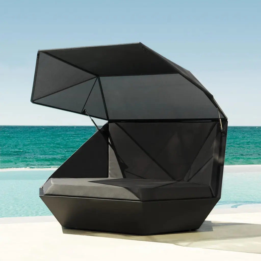 Daybed sunny white Lacquered with base structure in resin forindoor or outdoor use in white lacquered finish. With sunbrella topin white batyline canvas. Upholstered seat covered with indoor oroutdoor white vinyl fabric. With included 4 cushions 60 x 60cm each,covered with indoor or outdoor white vinyl fabric. With sound bluetoothsystem audio pack to link your tablet or smartphone to the sound systemvia Bluetooth. L 180 x D 180 x H 90cm, with opened sunbrella height is: 140cm.Also available in Option 2:With base structure in resin in white finish for indoor or outdooruse with colored changed option with red, or green, or blue, orpurple, or yellow Led light inside with remote control unit forchanging colors. Also included, a Led control by DMX wirelesssystem, you can choose between 2 options from: ProfessionalXLR DMX and Home WIFI DMX. (Remote control included).With sunbrella top in white batyline canvas. Upholstered seatcovered with indoor or outdoor white vinyl fabric. With included4 cushions 60 x 60cm each, covered with indoor or outdoor whitevinyl fabric.Also available in Option 3:With base structure in resin for indoor or outdoor use in blacklacquered finish. With sunbrella top in bronze batyline canvas.Upholstered seat covered with indoor or outdoor black vinylfabric. With included 4 cushions 60 x 60cm each, covered withindoor or outdoor black vinyl fabric. With sound bluetooth systemaudio pack to link your tablet or smartphone to the sound systemvia Bluetooth.