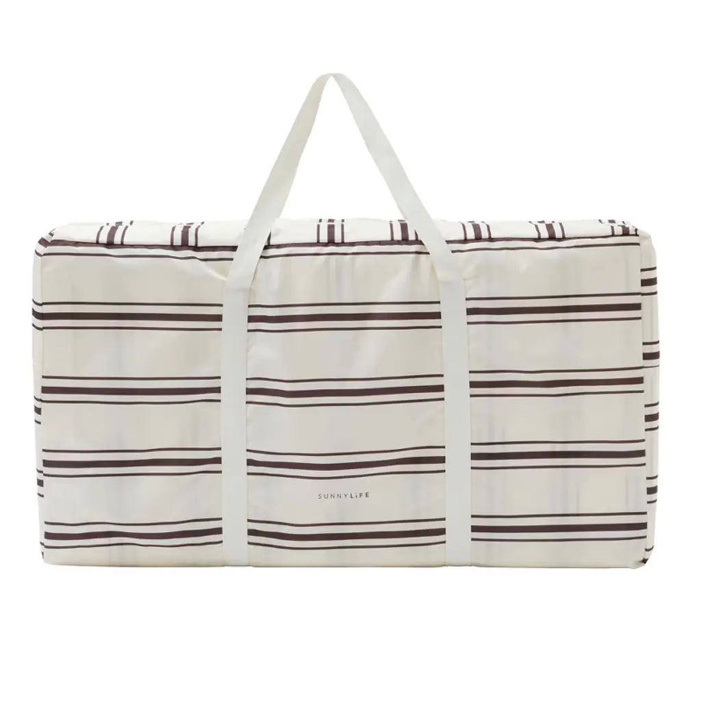 THE LOUNGER CHAIR: CHARCOAL STRIPE - Live your life in the sun with SUNNYLiFE! With a 6 setting adjustable recline, lounging in the sand just got a whole lot more luxurious with the SUNNYLiFE Lounger. Designed for ultimate comfort, this stylish chair features 6 adjustable recline settings, allowing you to customize your position for perfect relaxation. Whether you’re at the beach, in the park, or by the pool, this lounger adapts to your needs. Crafted from durable 300D polyester with a water and fade-resistant coating, it’s built to withstand the elements while maintaining its chic charcoal stripe design. With a sturdy, foldable steel frame and an included carry bag, transporting your lounge chair is a breeze. Perfect for those who love luxury with portability, the Lounger Chair brings comfort and style wherever you go. OVERVIEW: Adults Max 50kg/331lbs. Durable 300D polyester fabric with 5mm contrast piping trim. 6 adjustable settings. Foldable steel frame. Water resistant and fade resistant coating. Carry storage bag. While our loungers are designed to be enjoyed both indoor and outdoor, they are portable rather than permanent outdoor furniture so should be stored in their bag out of the weather when not in use which will prevent rust and fading. SIZE: 70.9 x 22 x 3.5 inch.
