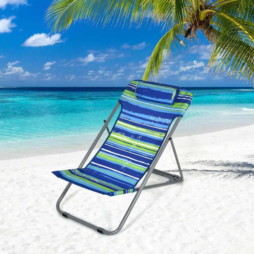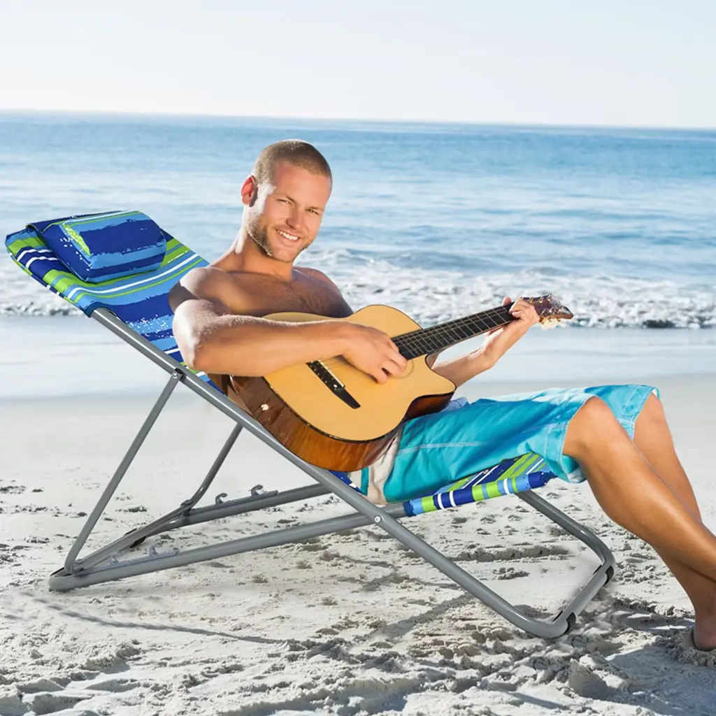 Enjoy your leisure time with our lounge chairs! Our recliner features 3-position adjustable backrest and comfy headrest to suit your different needs, relieving your spine while also relaxing your neck and head. With thickened fabric and sturdy metal frame, the recliner will not only ensure lasting use, but also allow you to spend a leisurely time on the beach, camp, or garden. The chair allows you to stretch to the comfort of your body and quickly relieve the pressure of blood circulation. With foldable and space-saving design, the chair set can be stored in anyplace wherever you want and can take the chair to enjoy the lazy afternoon in the beach tour!Features3-position adjustable backrest satisfies your different needsDurable and sun-proof fabric materials for long lasting useSturdy and durable metal frame ensures strong supportComfy headrest helps to relieve your pressureFolds up for easy storage in your home, car, and moreEasy-cleaning for your convenienceRequires no assembly and suitable for various occasionsSpecifications Color: Blue/Orange/Green Material: Steel, Sponge, Fabric Dimension of Each Chair: 24.5"x 37"x 26"-33" (W x D x H) Weight Capacity of Each Chair: 300 lbs Net Weight: 20 lbs Package include: 2 x Beach Chair 1 x Instruction