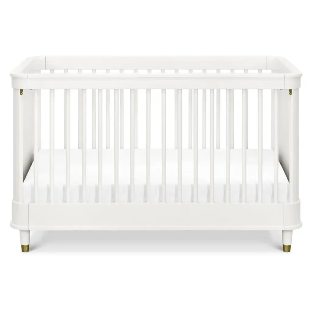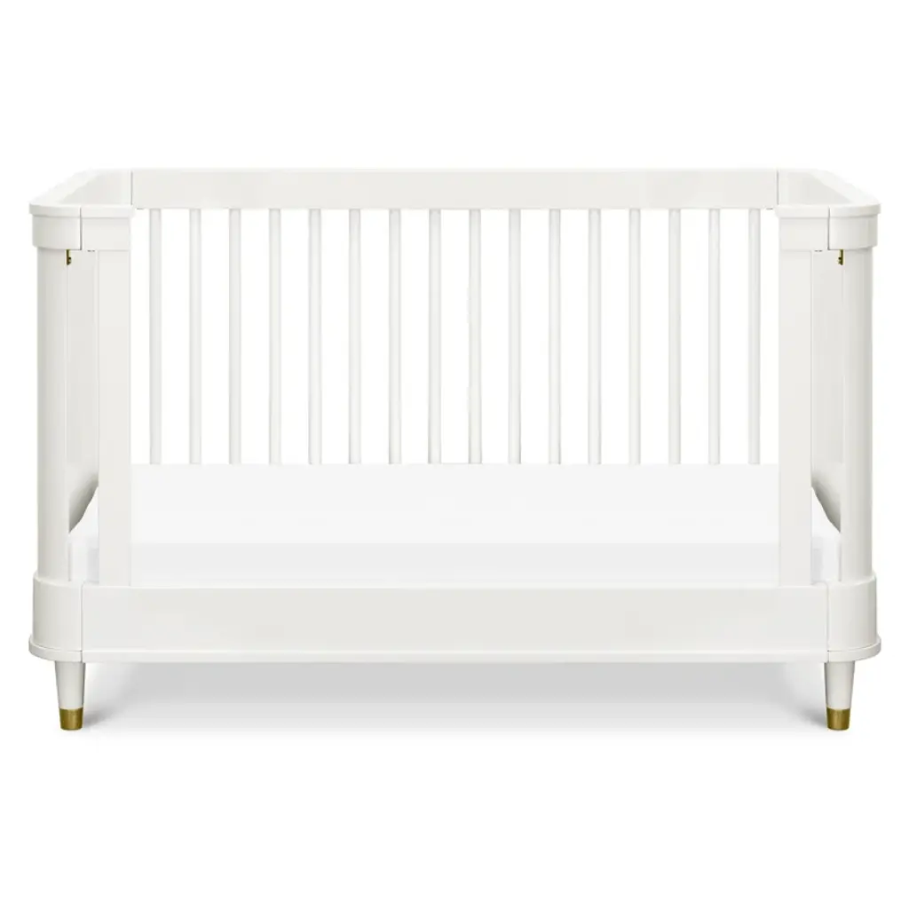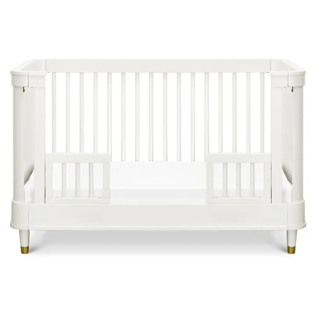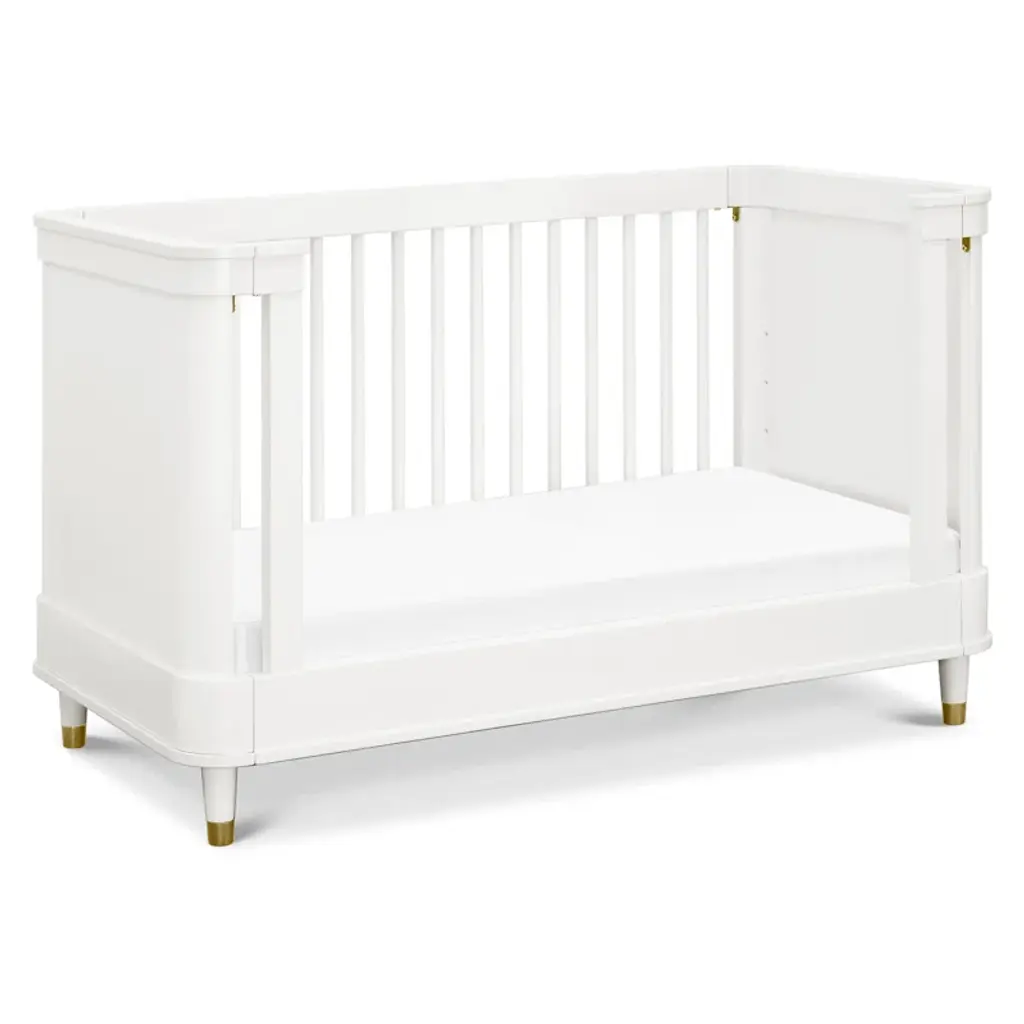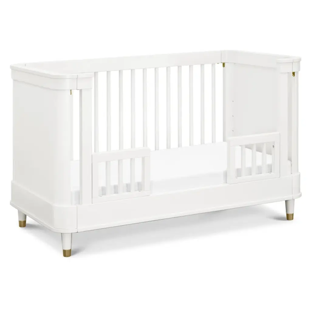 Ease into contemporary style with the Tanner 3-in-1 Crib. Featuring a gently curved silhouette with solid rounded side panels and elegant bronze metal feet accents, the Tanner is an effortlessly transitional piece for the home. Crib converts to a toddler bed and daybed, and fits any standard full-size crib mattress. Available in a Warm White finish.