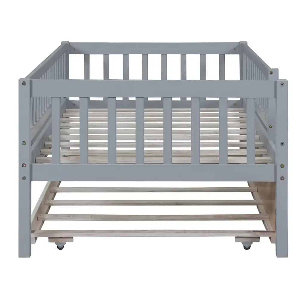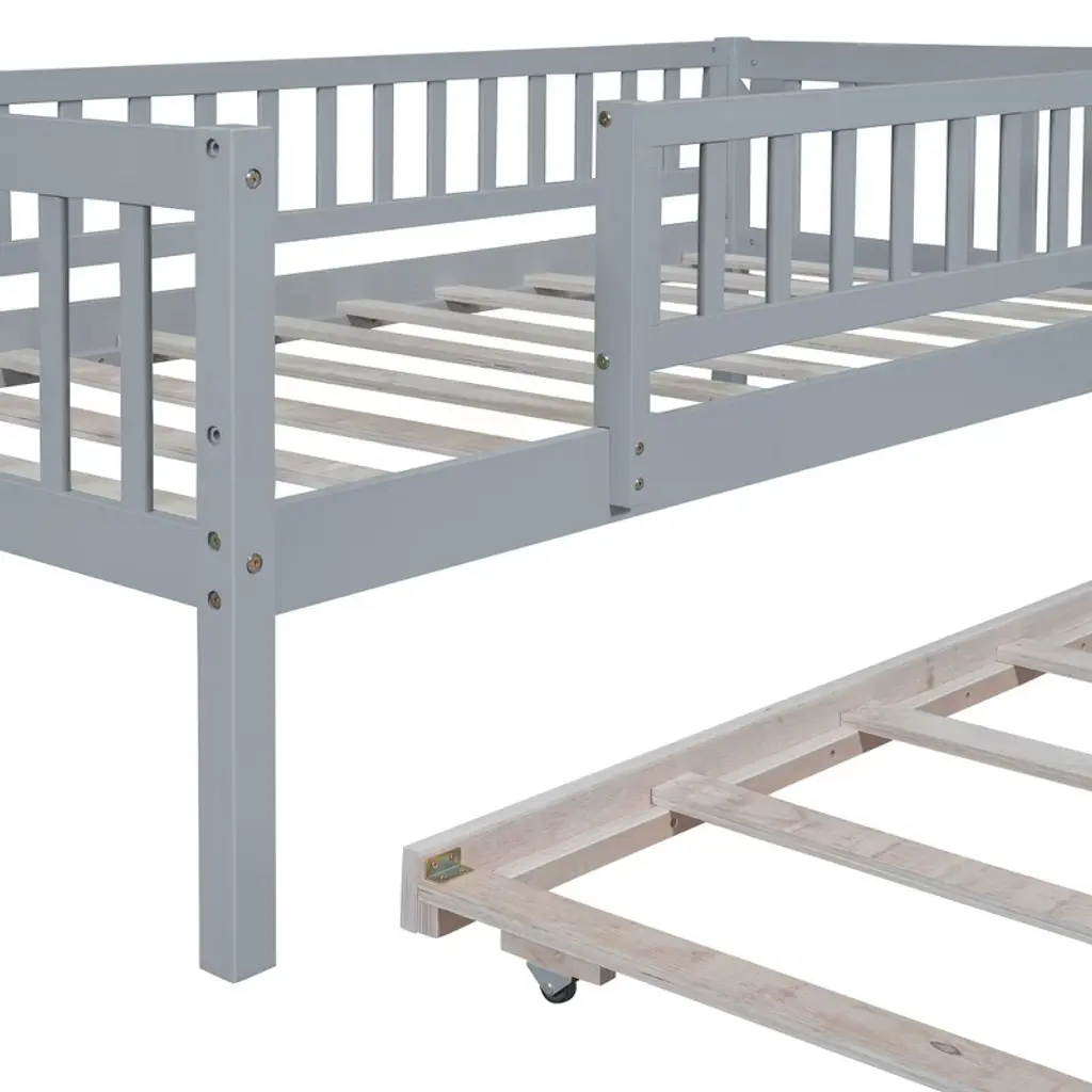 Twin Size Wood Daybed With Trundle And Fence Guardrails Gray