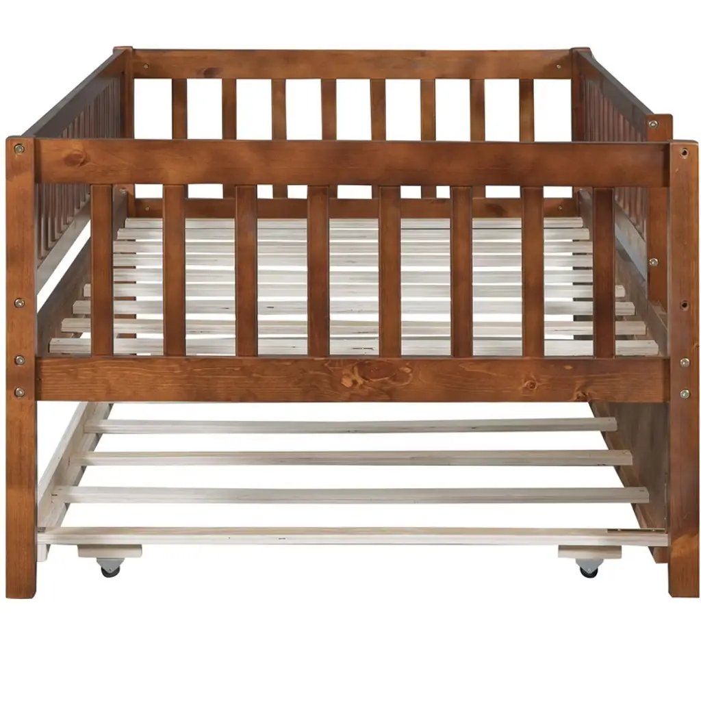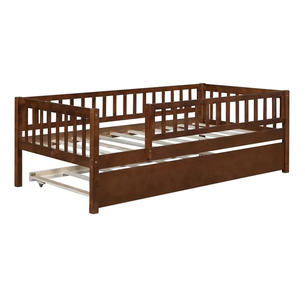 Twin Size Wood Daybed With Trundle And Fence Guardrails Walnut