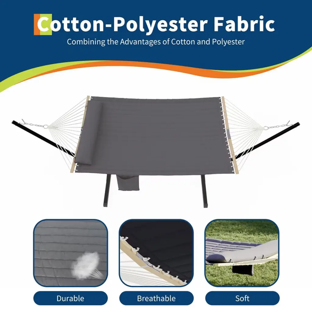 Experience ultimate relaxation with the Ultra-Comfort 2-Person Hammock Set, designed to provide supreme comfort and durability for outdoor lounging. This extra-wide hammock features ergonomic curvature and breathable fabric that evenly distributes weight, comfortably supporting up to 450 pounds—perfect for two adults, kids, or pets. Whether you're reading, napping, or simply enjoying quality time, this hammock offers a cozy retreat.The innovative steel frame is collapsible and rust-resistant, folding down to a slim 5-inch profile for easy storage under beds or in car trunks. Setup is quick and tool-free, taking just 60 seconds, making it ideal for apartments, balconies, or spontaneous backyard relaxation.Built to withstand all weather conditions, the triple-coated galvanized steel frame resists rust from rain, salt air, and humidity while the UV-resistant fabric maintains its vibrant color and strength through sunny summers and chilly winters.Take your relaxation on the go with the included waterproof carrying bag featuring reinforced handles. This lightweight, portable set is perfect for camping trips, picnics, tailgate parties, or any outdoor adventure.Smart features enhance your experience, including detachable side pockets for drinks, books, or phones, and adjustable hanging chains for personalized height and sway intensity. Elevate your outdoor leisure with the Ultra-Comfort 2-Person Hammock Set—where comfort meets convenience and durability.