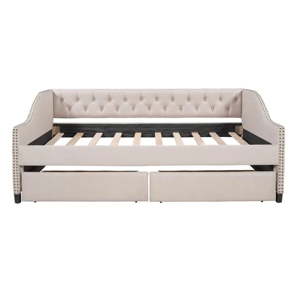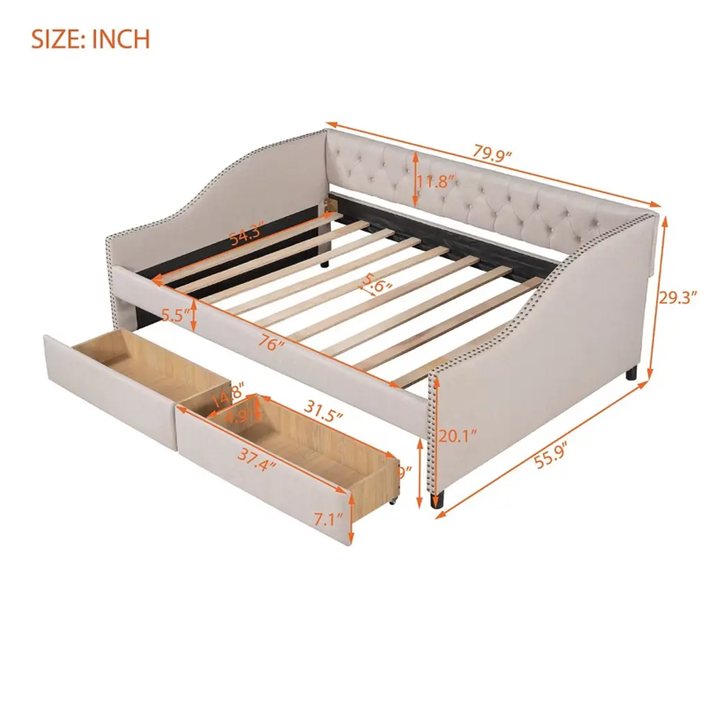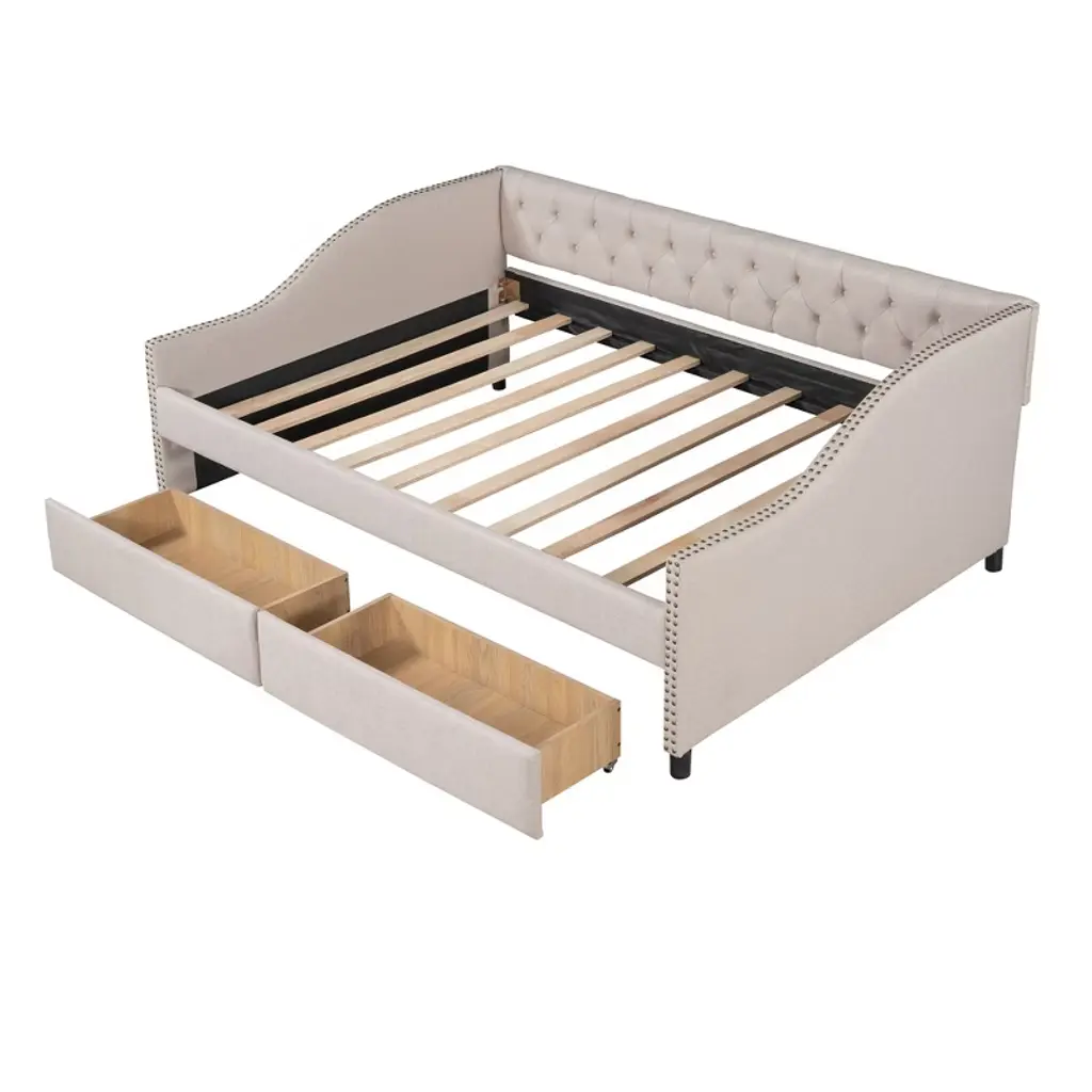 Upholstered Daybed With Two Drawers Wood Slat Support Beige Full Size