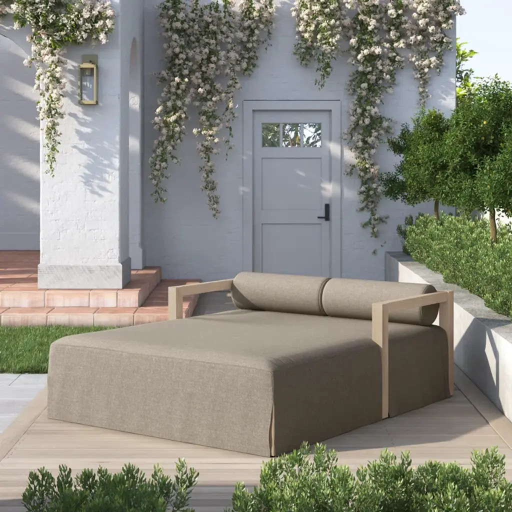 A soft, durable slipcover brings a complementary casual and laid-back look to structured framing of FSC®-certified teak. A bolster back cushion offers support and comfort in this outdoor daybed. Made in Italy, this sustainably made fabric is antimicrobial and highly resistant to sunlight, abrasion and chlorine. Cover or store indoors during inclement weather and when not in use.