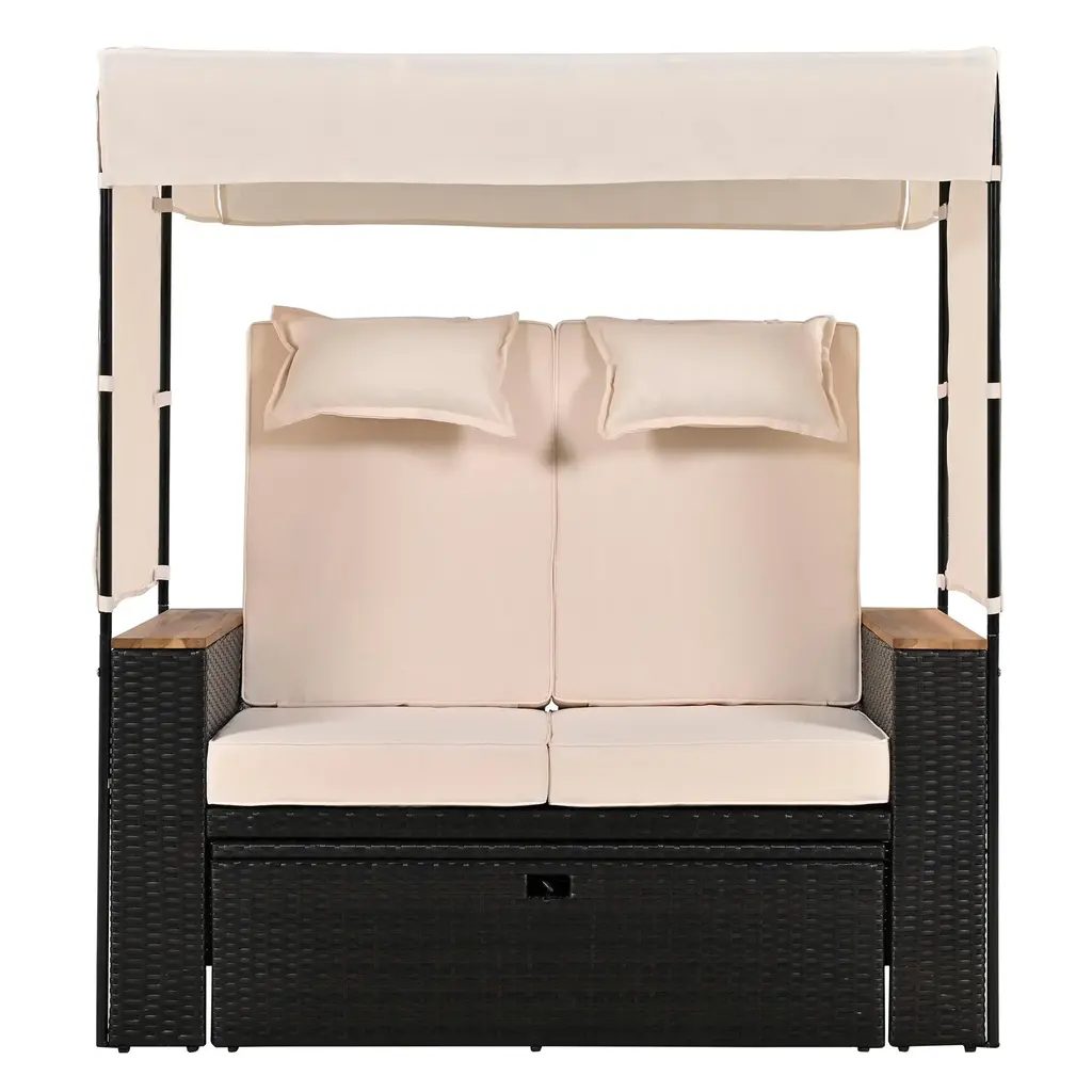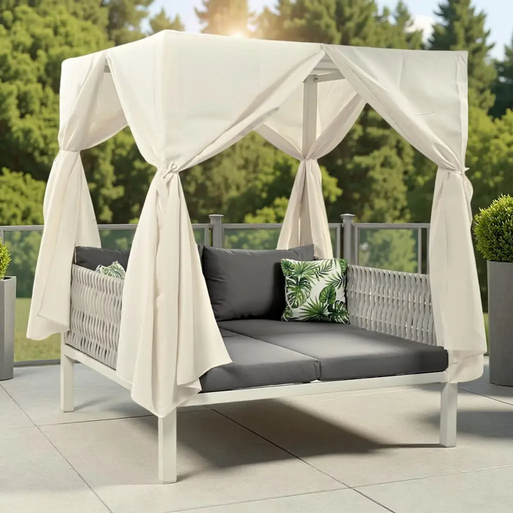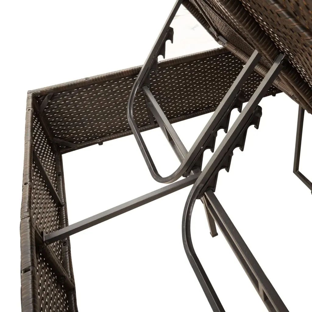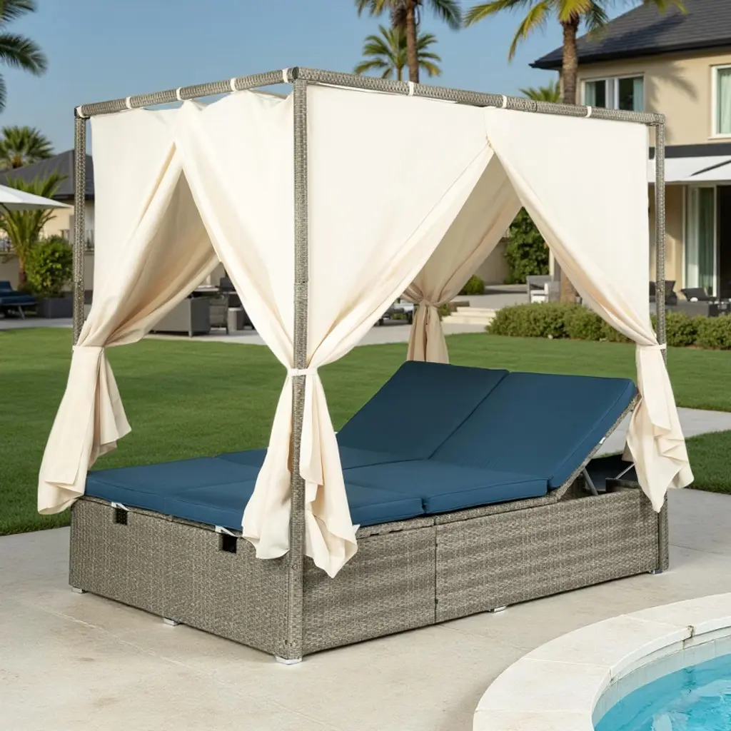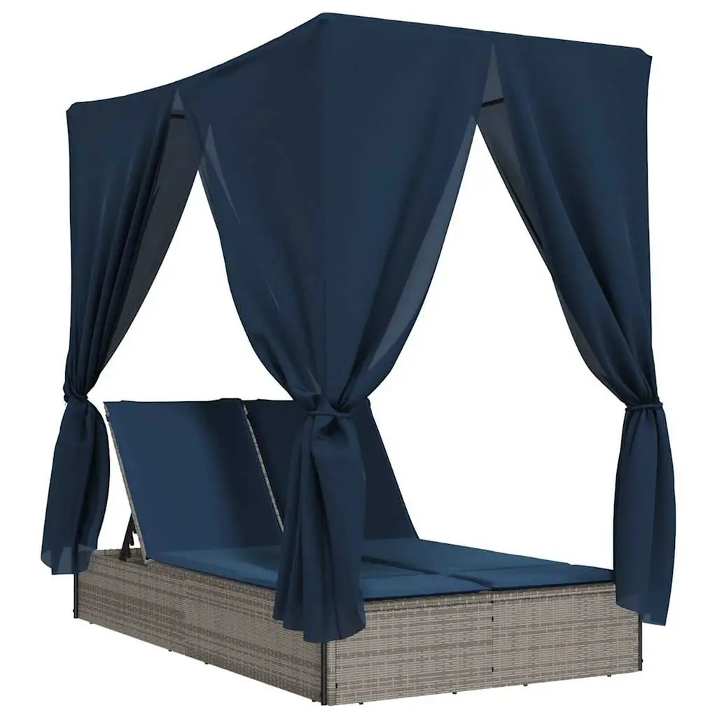 Relax and enjoy the outdoors on this comfortable double patio sun lounger!Durable material: PE rattan, also known as poly rattan, is a strong, low-maintenance synthetic material that looks like natural rattan. It's lightweight, easy to clean, and commonly used for outdoor furniture due to its durability and weather-proof properties.Adjustable backrest: This outdoor furniture features a backrest with 4 adjustable positions, allowing you to easily find the most comfortable and suitable position for relaxation.Practical roof and curtains: Thanks to the roof and curtains, you can create a cool, pleasant outdoor environment throughout the day.Comfortable seat experience: This outdoor furniture, complete with thickly padded cushions, offers a comfortable seating experience.Removable and washable cover: These seat cushions feature removable covers for easy washing and maintenance.Good to know:To make sure your outdoor furniture stays beautiful, we recommend protecting it with a waterproof cover.