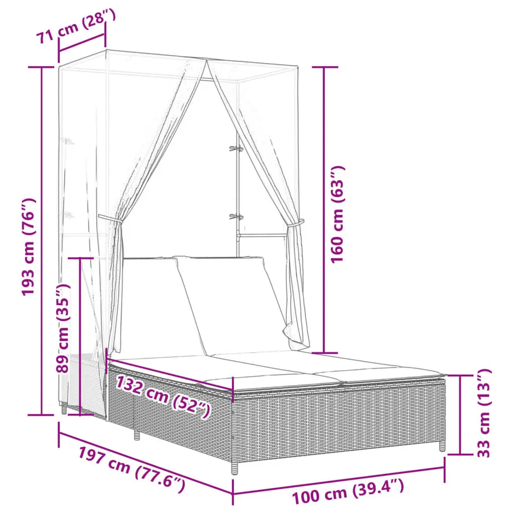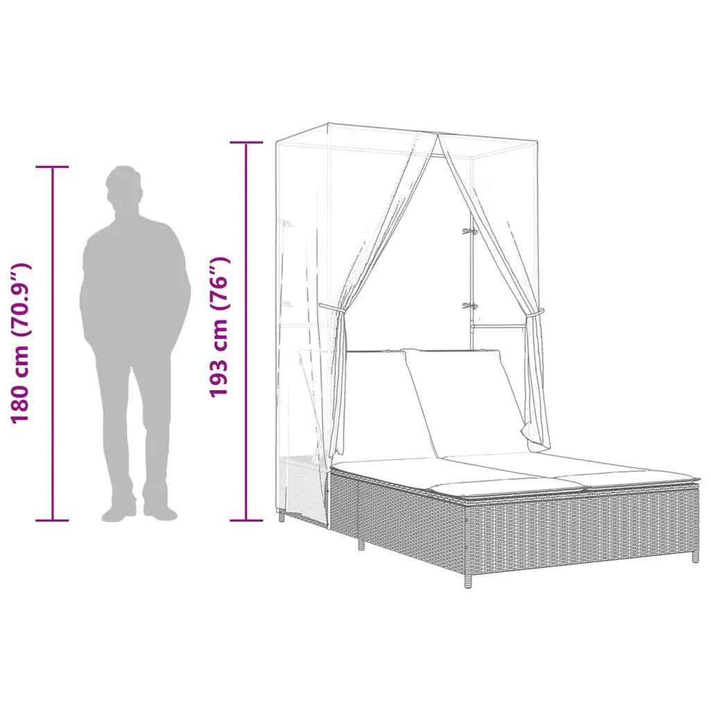 Relax and enjoy the outdoors on this comfortable patio double sun lounger!Durable material: PE rattan, also known as poly rattan, is a strong, low-maintenance synthetic material that looks like natural rattan. It's lightweight, easy to clean, and commonly used for outdoor furniture due to its durability and weather-proof properties.Adjustable backrest: This outdoor furniture features a backrest with 4 adjustable positions, allowing you to easily find the most comfortable and suitable position for relaxation.Practical roof and curtains: Thanks to the roof and curtains, you can create a cool, pleasant outdoor environment throughout the day.Comfortable seat experience: This outdoor furniture, complete with thickly padded cushions, offers a comfortable seating experience.Removable and washable cover: These seat cushions feature removable covers for easy washing and maintenance.Good to know:To make sure your outdoor furniture stays beautiful, we recommend protecting it with a waterproof cover.