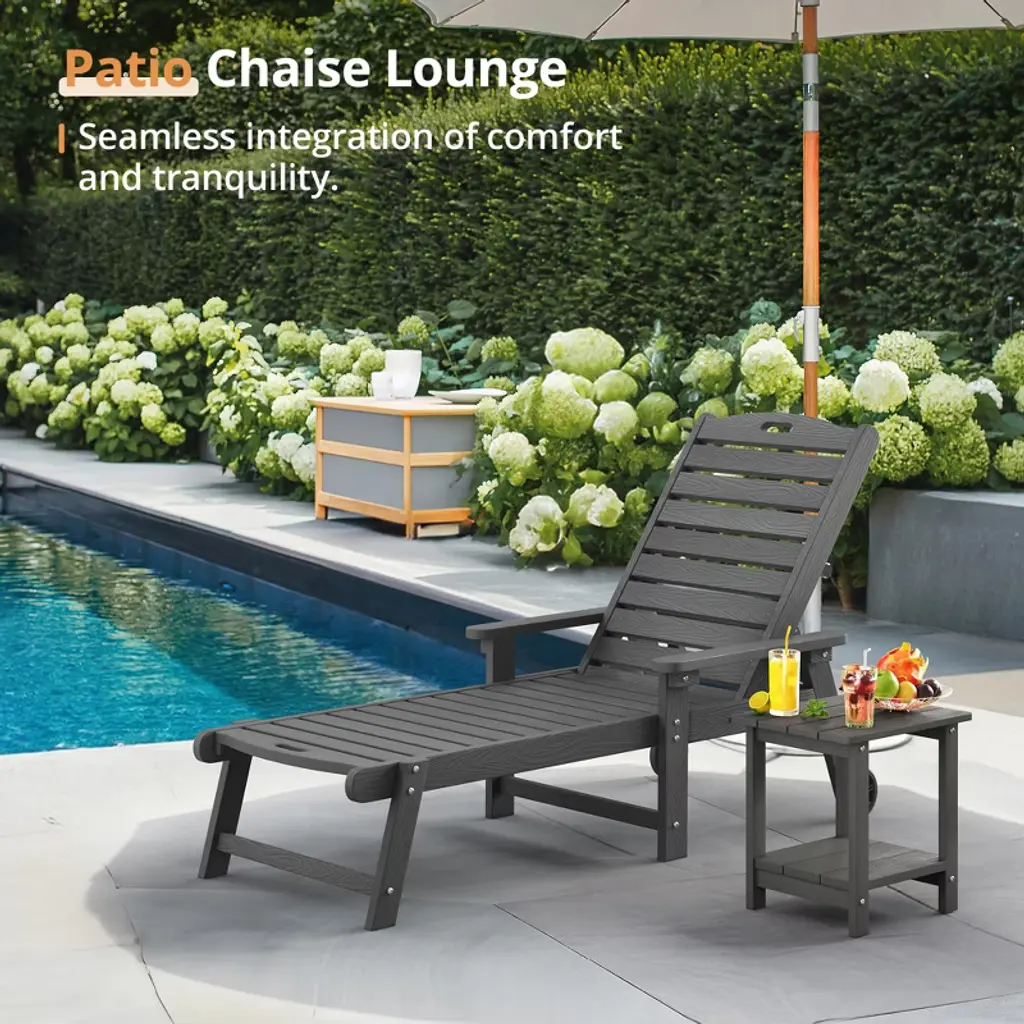 This Folding Sun Lounger with Wheels is perfect for lazy afternoons in your garden or by the pool. It's got a modern look and practical design that’s comfy whether you’re catching some sun or enjoying a book on a warm day. It's super versatile, fitting right into all sorts of outdoor spots, like backyards, balconies, or patios, effortlessly combining usefulness and style. Adjustable Comfort: With five adjustable backrest positions, you can easily pick the best angle for your lounging, whether that's lying back or sitting more upright. It really amps up your relaxation with options tailored to your comfort.Easy Transportation: Those wheels mean you can move it around effortlessly in your outdoor space, so you can find that perfect sunny or shady spot with just a gentle push.Space-Saving Storage: It's foldable, so when you’re not using it, you can tuck it away easily to save space. Perfect for smaller areas or just keeping things tidy.Durable Construction: Made from quality UV resistant Polypropylene, this sun lounger can handle the weather without fading or losing its vibrant look, keeping it in the outdoor furniture mix for years.Stylish Details: Its trendy anthracite color fits in nicely with any garden vibe while offering a comfy spot to kick back. The modern design enhances any outdoor setting, giving it a touch of class.