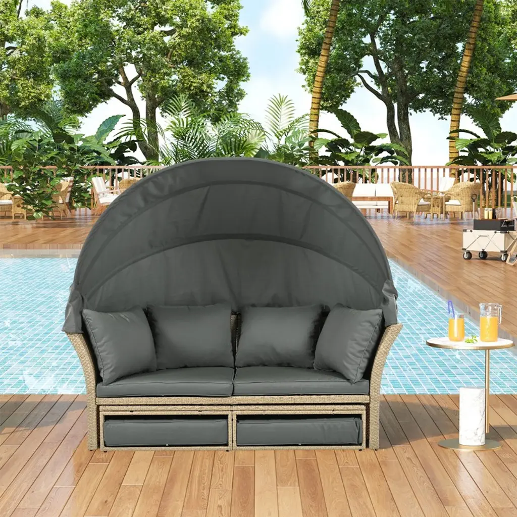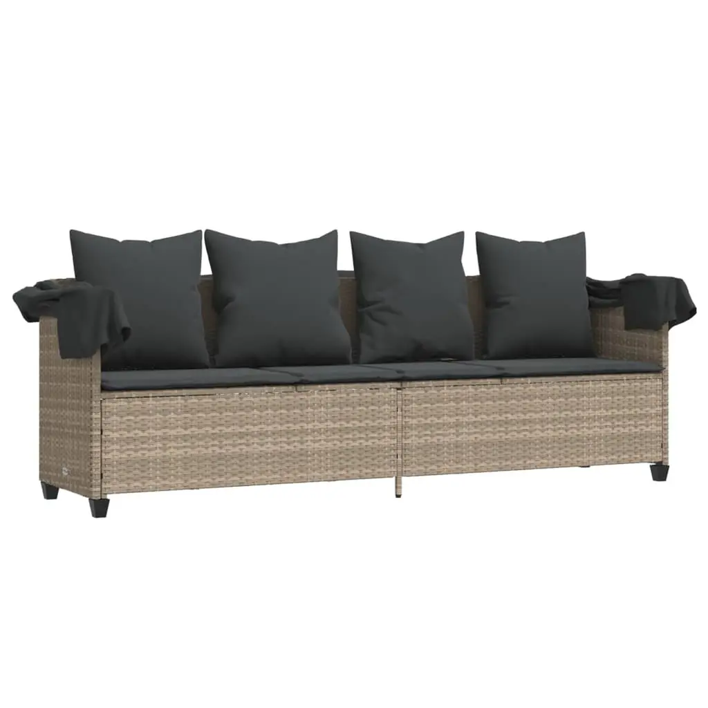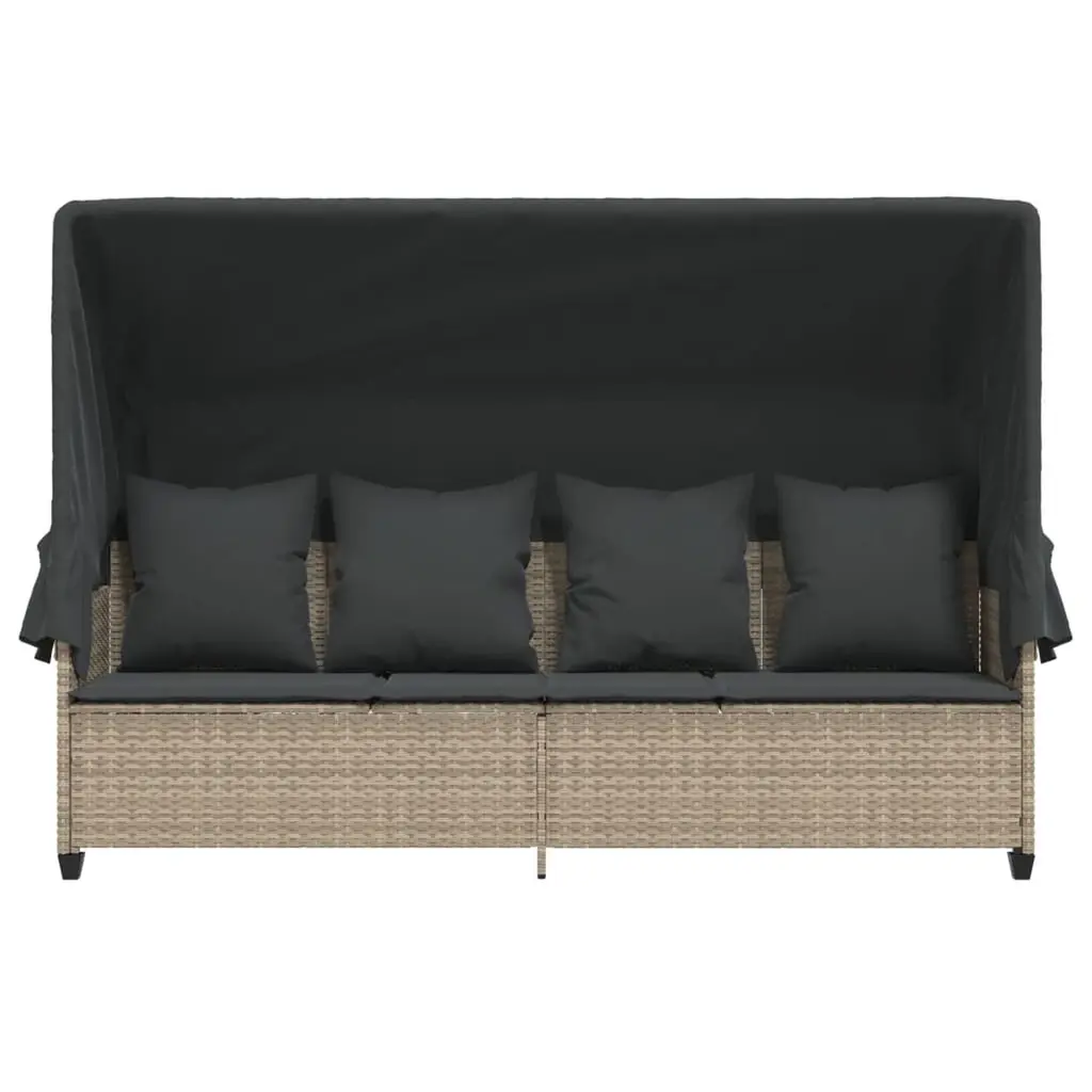 This adjustable sun lounger with a canopy and cushions blends style with comfort for all your outdoor downtime needs. Its sleek light grey design adds a modern touch to your balcony or sunroom and invites relaxation while you soak up the sun or enjoy a bit of shade. Comfy Seating: The sun lounger includes four soft back cushions and a comfy seat cushion made of weatherproof fabric, giving you all the comfort you need while sunbathing or reading a book. The cushions are removable and washable, making it easy to keep clean.Weather-Resistant Materials: Built to handle the weather, this lounger has UV-protected fabric and durable synthetic poly rattan that won't fade in the sun. The powder-coated steel frame adds even more sturdiness, ensuring long-lasting use no matter the weather.Versatile Indoor/Outdoor Use: This multifunctional piece works beautifully in many settings, perfect for sunny days by the pool, chill evenings on the patio, or lively garden parties. Its stylish design makes it a good fit for both indoor and outdoor décor.Adjustable Features: Made for your comfort, the adjustable backrest and footrest can be set to different angles, so you can lounge just how you like. With three height levels, you can easily tweak it to your preferences.Easy Assembly: Putting this together is a breeze with just two people and simple tools, plus clear instructions are included to get you relaxing on your new sun lounger in no time.