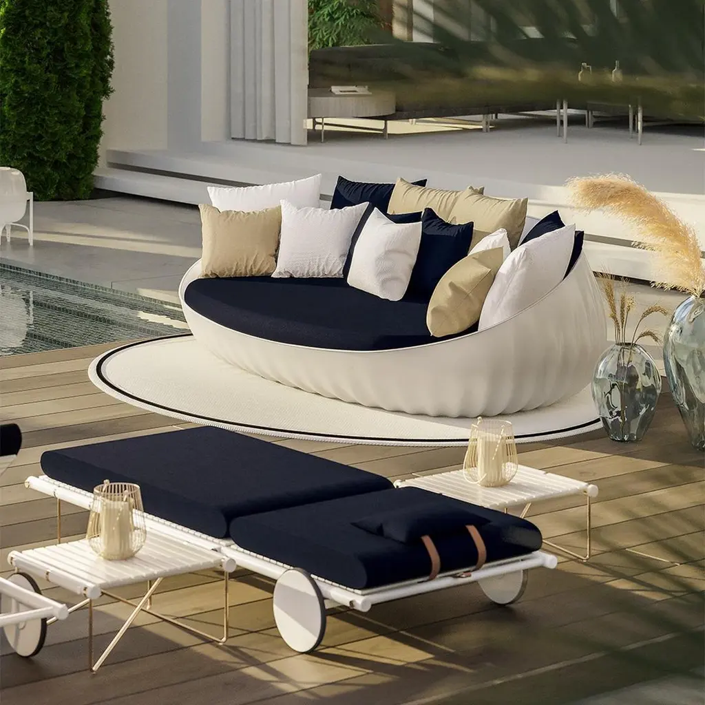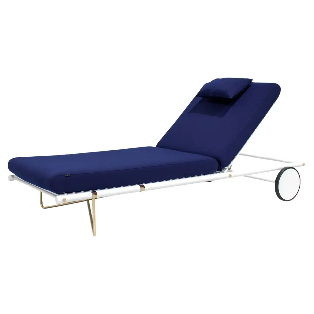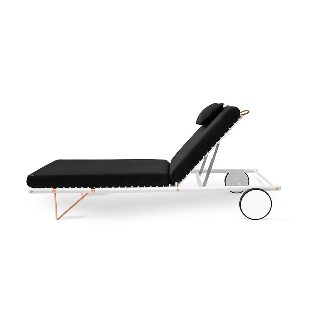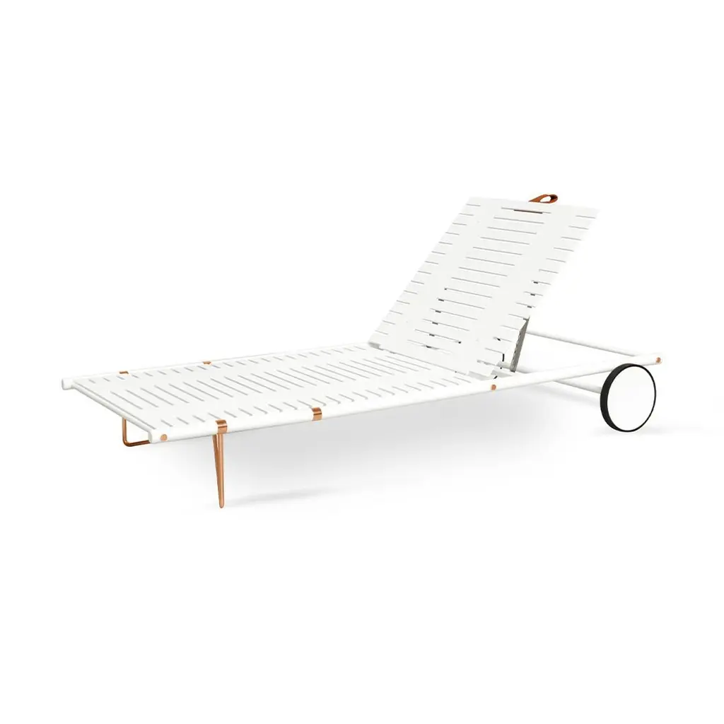 Noa SunbedWhere sleek modern design meets everyday functionality. Crafted with a premium foam cushion wrapped in durable, weather-resistant fabric, it promises not just exceptional comfort but lasting quality. The removable, washable cushion and adjustable backrest allow to tailor your lounging experience effortlessly to suit any moment.Equipped with wheels for easy mobility.The whole design of this elegant outdoor sunbed was developed according to the following structure: -Top: White matte lacquered aluminum and stainless steel;-Details: Copper plated stainless steel;-Upholstery: Acrylic fabric;-Straps: Outdoor leather.All Myface materials are from premium suppliers, engineered to offer the best performance possible outdoors.Water, Mold, Mildew, UV and Fading resistance are some of the characteristics that you can expect from both materials, that are available in a wide array of colors and patterns.Noa, outdoor sunbedSome of the customization options for your Noa sunbed: Myface White, Myface Blue, Dark Bronze, Copper Brushed, Gemini Light Orange, Gemini Red, and Gemini Bordeaux.Designed with meticulous attention to detail, the Noa sunbed combines elegant copper details and lacquered aluminum lines in an extremely comfortable and sophisticated lounger. Also features an automatic lifting mechanism that helps to find the best possible position for your sunbath experience.