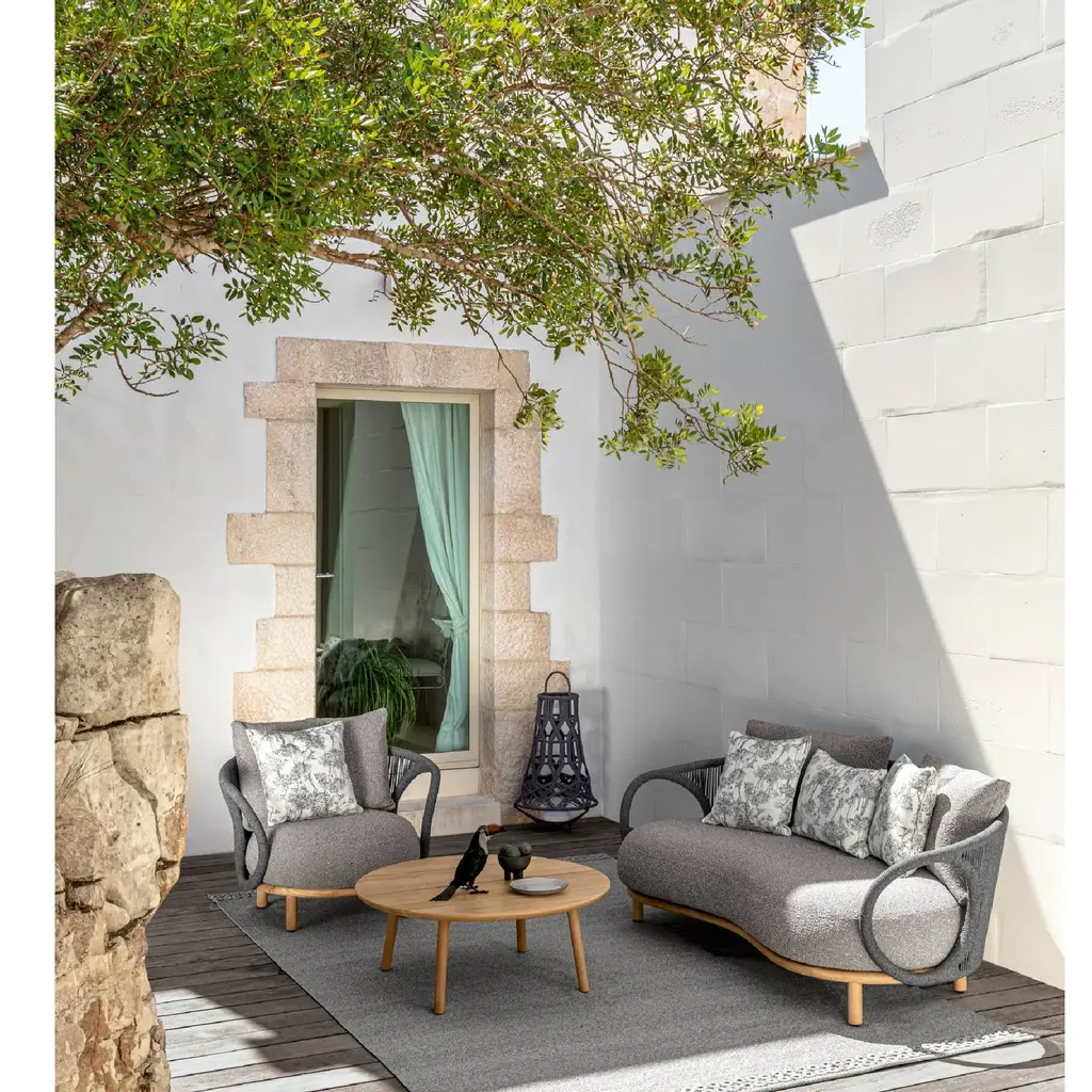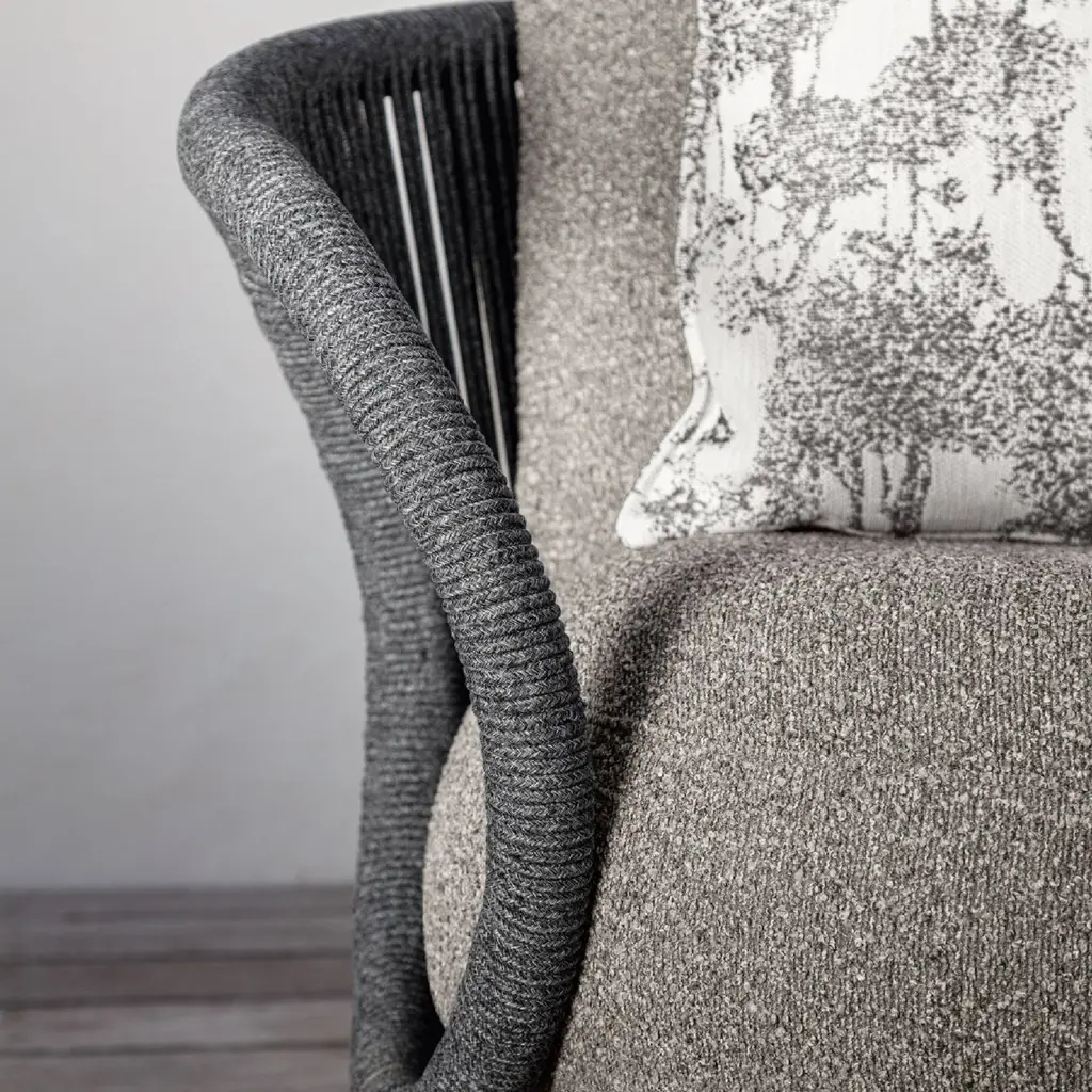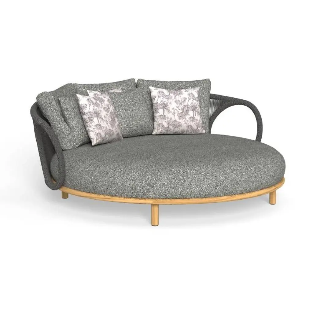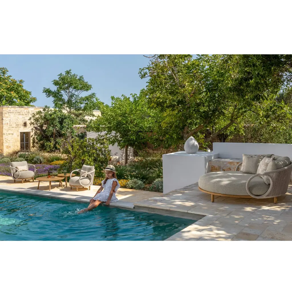 The Karen daybed gives the outdoor environment an intimate and reassuring atmosphere, thanks to the African-inspired design that recalls the appearance of a protective cocoon. The craftsmanship of the back, supported by countless threads that are intertwined with the armrests rings, gives rise to a meeting between cultures. The curved and enveloping lines of the upholstery and the fabrics of the cushions radiate the unique beauty of African lands.