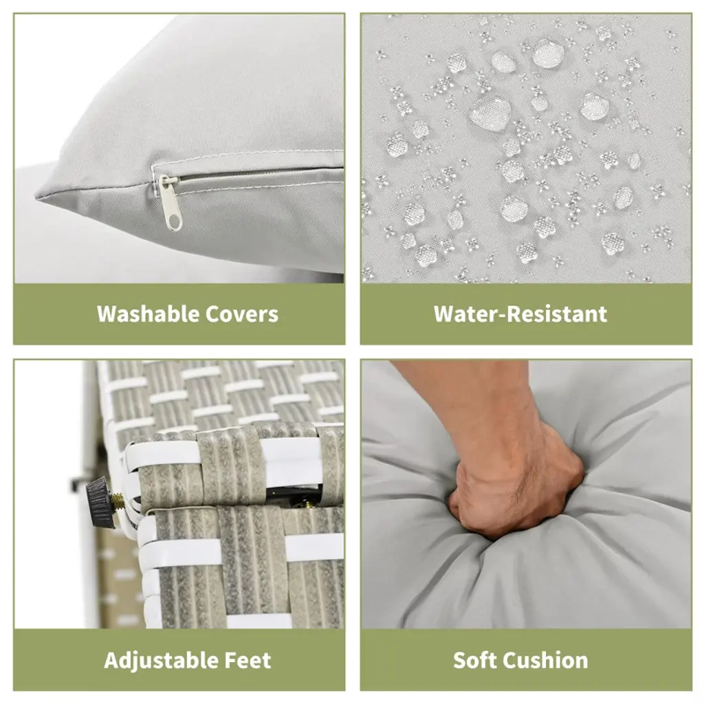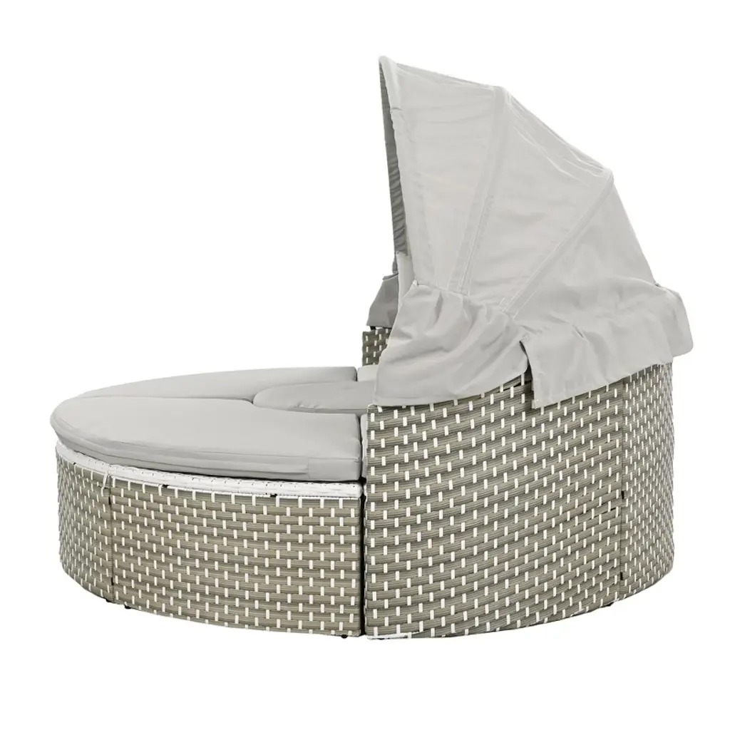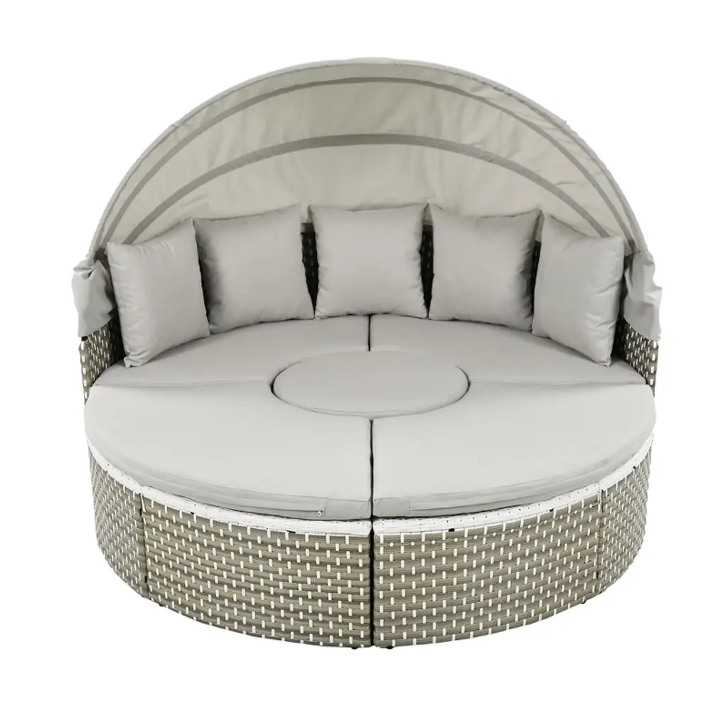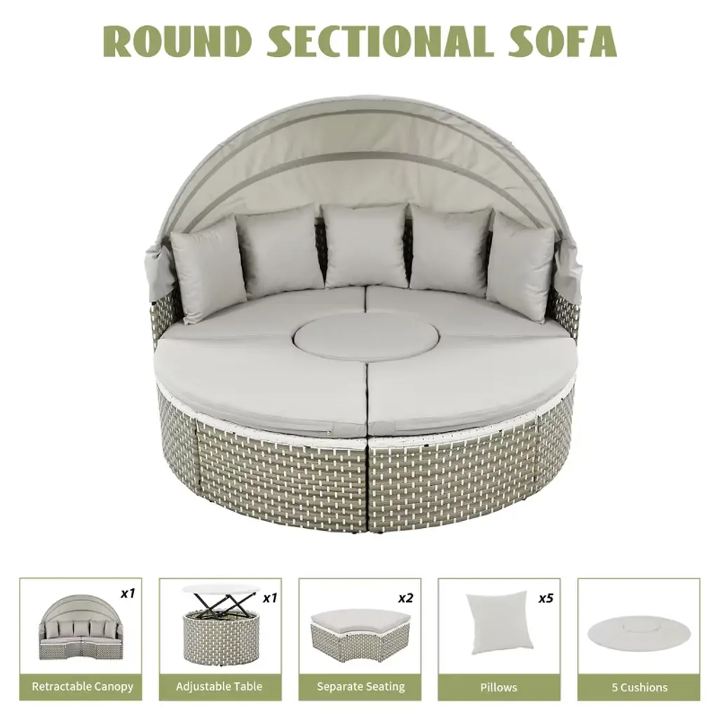 Elevate your outdoor living with this versatile rattan daybed set, combining luxury and functionality for ultimate relaxation. Crafted from durable, all-weather PE rattan woven over a sturdy metal frame, the two-tone design adds modern elegance to any patio. The retractable canopy offers adjustable shade, while the sectional sofa easily converts into a spacious daybed. Featuring an adjustable center table (perfect for snacks or drinks) that transforms into extra seating, five plush foam cushions, and washable covers for easy maintenance. With adjustable feet for stability on any surface, this daybed invites you to unwind in style, rain or shine. Perfect for lounging solo or entertaining guests in comfort.