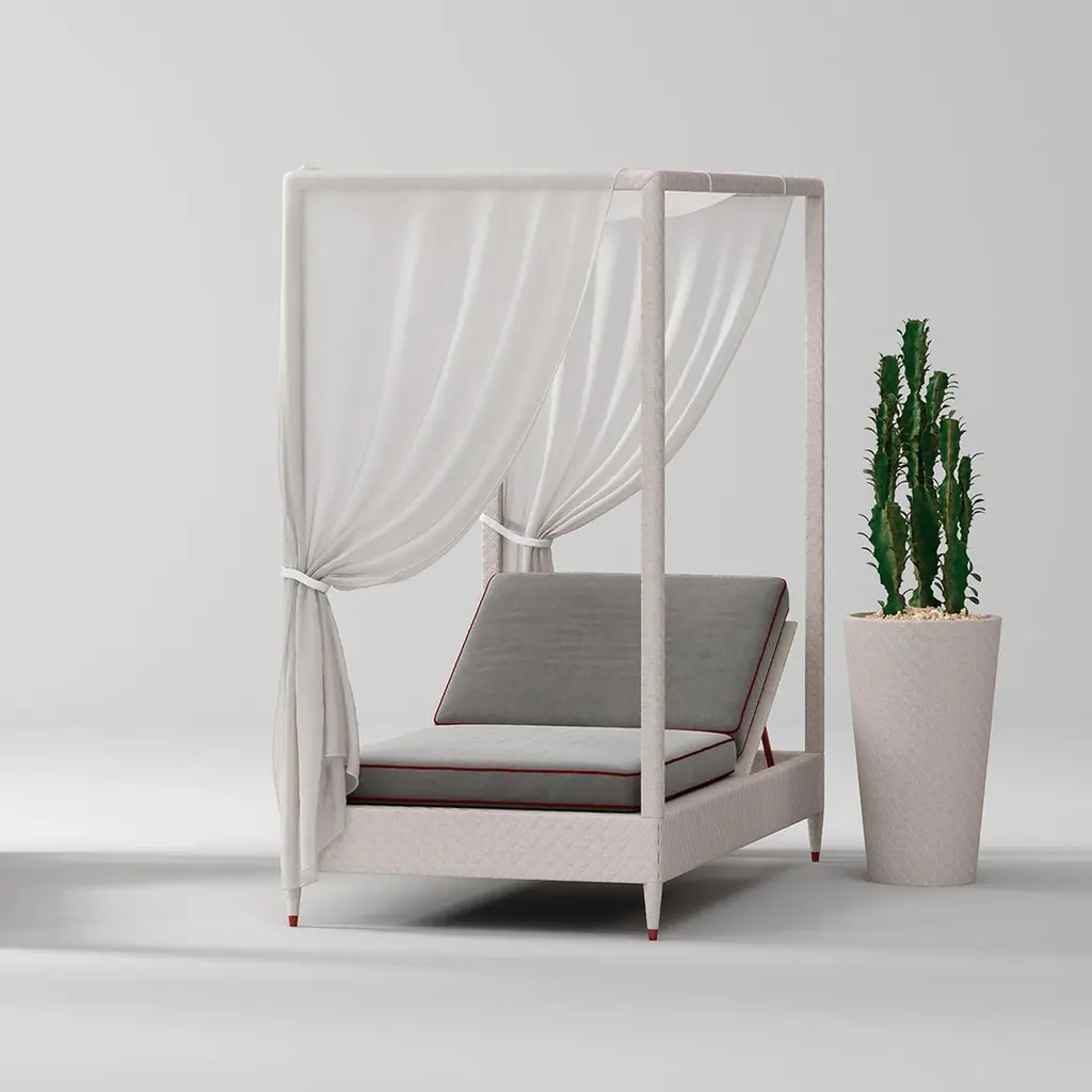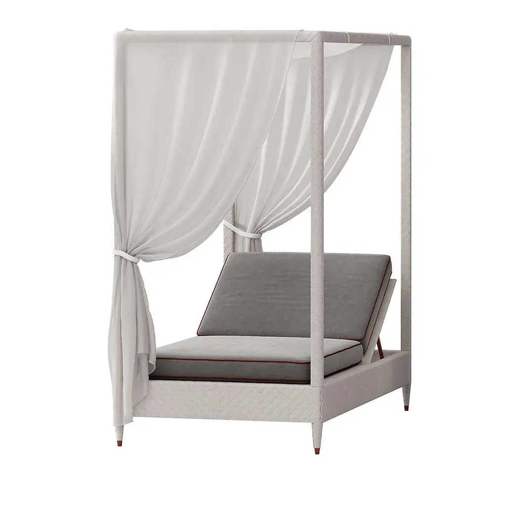 This stunning canopy daybed creates the perfect place to enjoy the outdoors in a stylish design that will stand out in a modern patio, pool, or veranda. Crafted of weather- and water-resistant aluminum covered with handwoven resin, the four-post frame features a reclining platform bed with two polyurethane foam-padded cushions. The gray fabric upholstery is treated with a patented waterproof Tyvek material. The design is completed by a white fabric canopy that gently drapes on the short sides to create a relaxing and serene atmosphere. The frame is available also in black, ivory, and red.