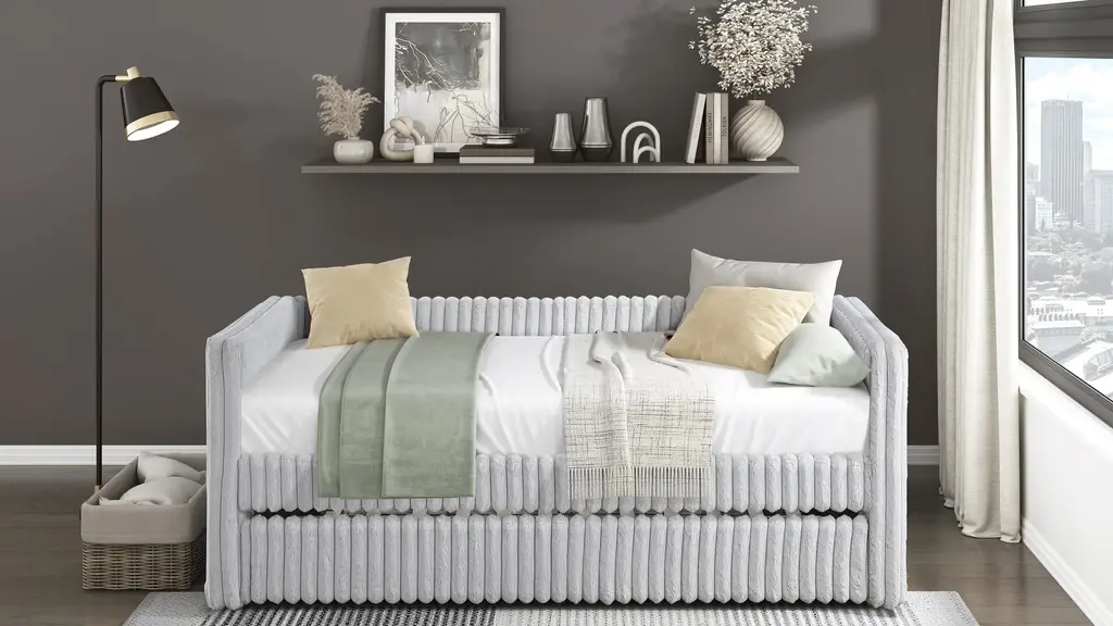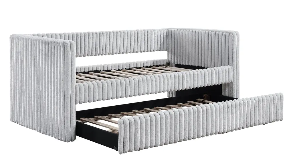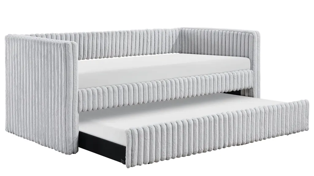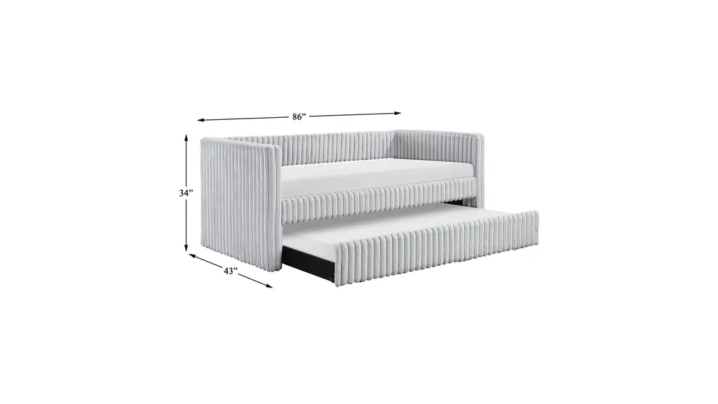 Maximize your guest room or living space with this stylish Woodwell Daybed with Trundle, featuring a convenient pull-out trundle bed for extra sleeping space. Crafted with a sturdy plywood frame and soft corduroy fabric upholstery, this daybed offers both comfort and durability. The trundle bed, equipped with casters for easy movement, provides a seamless sleeping solution for overnight guests. Designed to eliminate the need for a foundation or box spring, this daybed offers a sleek, modern look that complements various decor styles.
