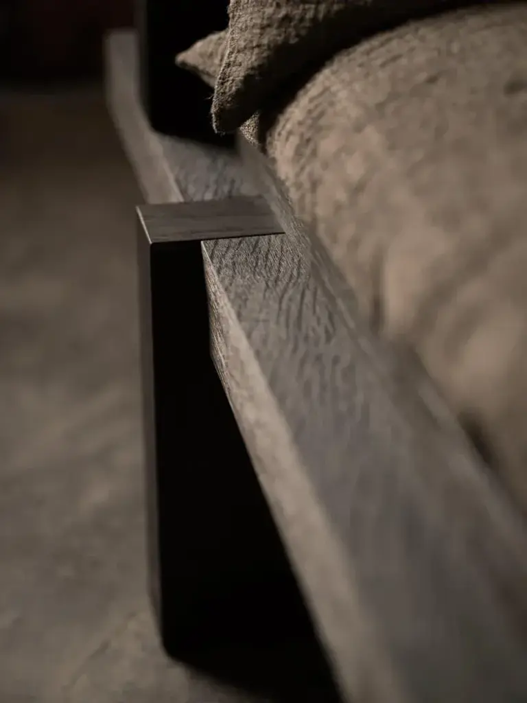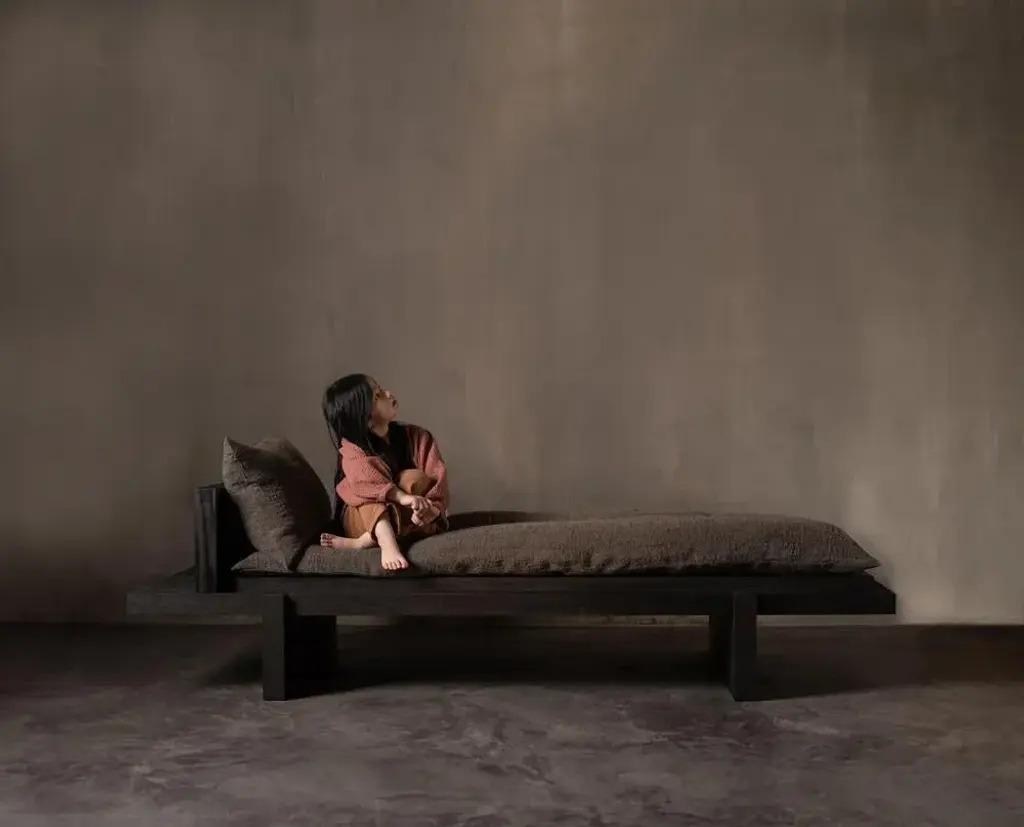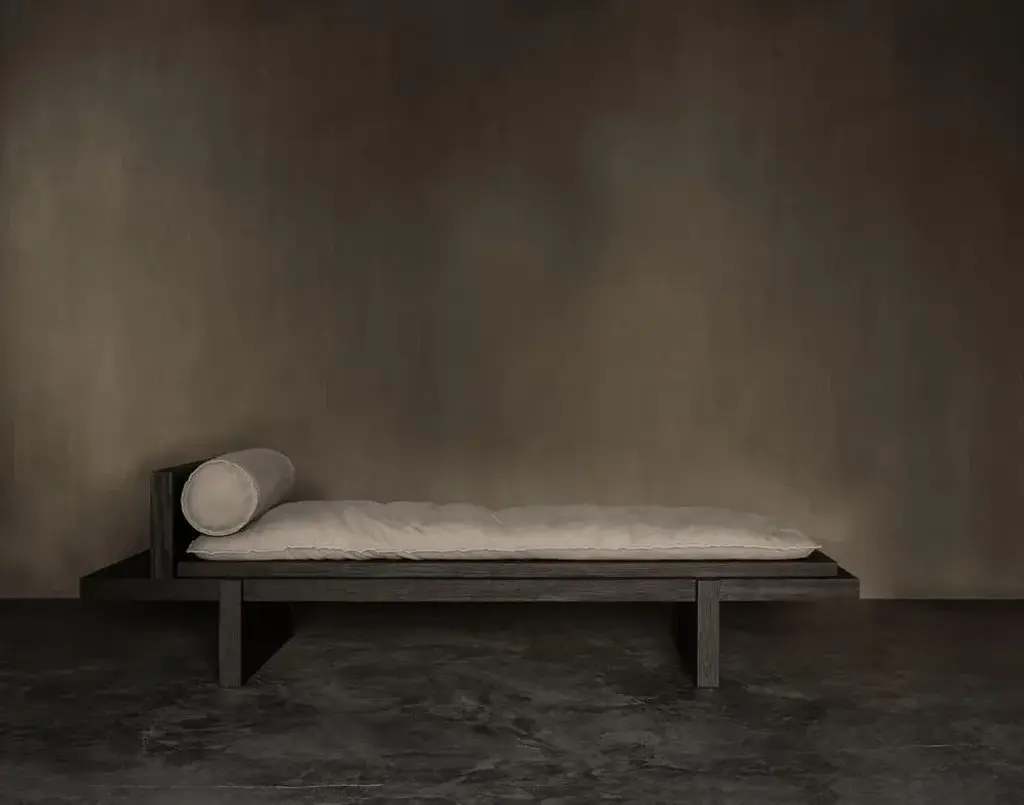 Yoishu Daybed by Kana objects. Dimensions: D 80 x W 220 x H 35 cm. Materials: smoked oak, vintage hemp fabric. Also available in natural oak and swamp oak. Available in different fabrics. Japanese Daybed The Yoishu series represents a unique fusion of tradition and contemporary design. The sleekness of the minimalist design is given a soft edge by the choice of materials.