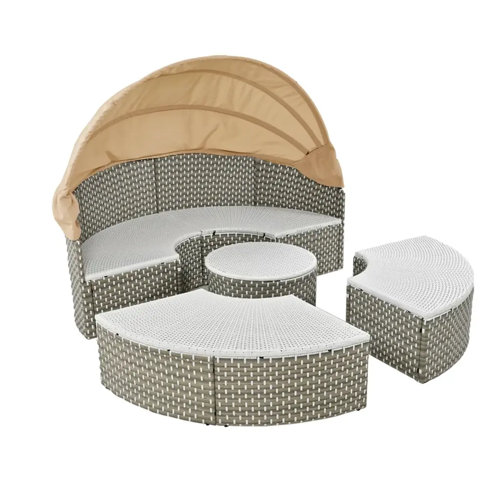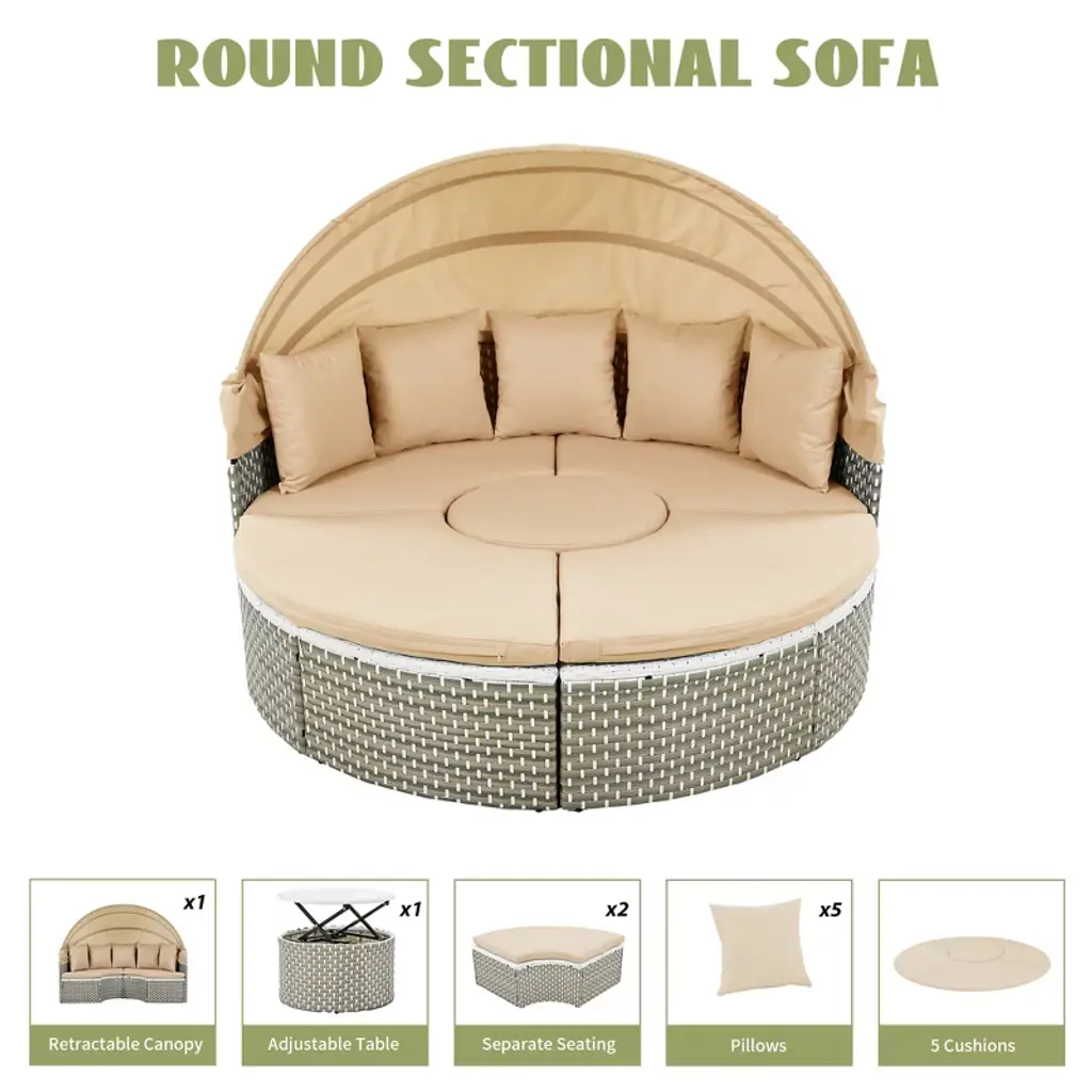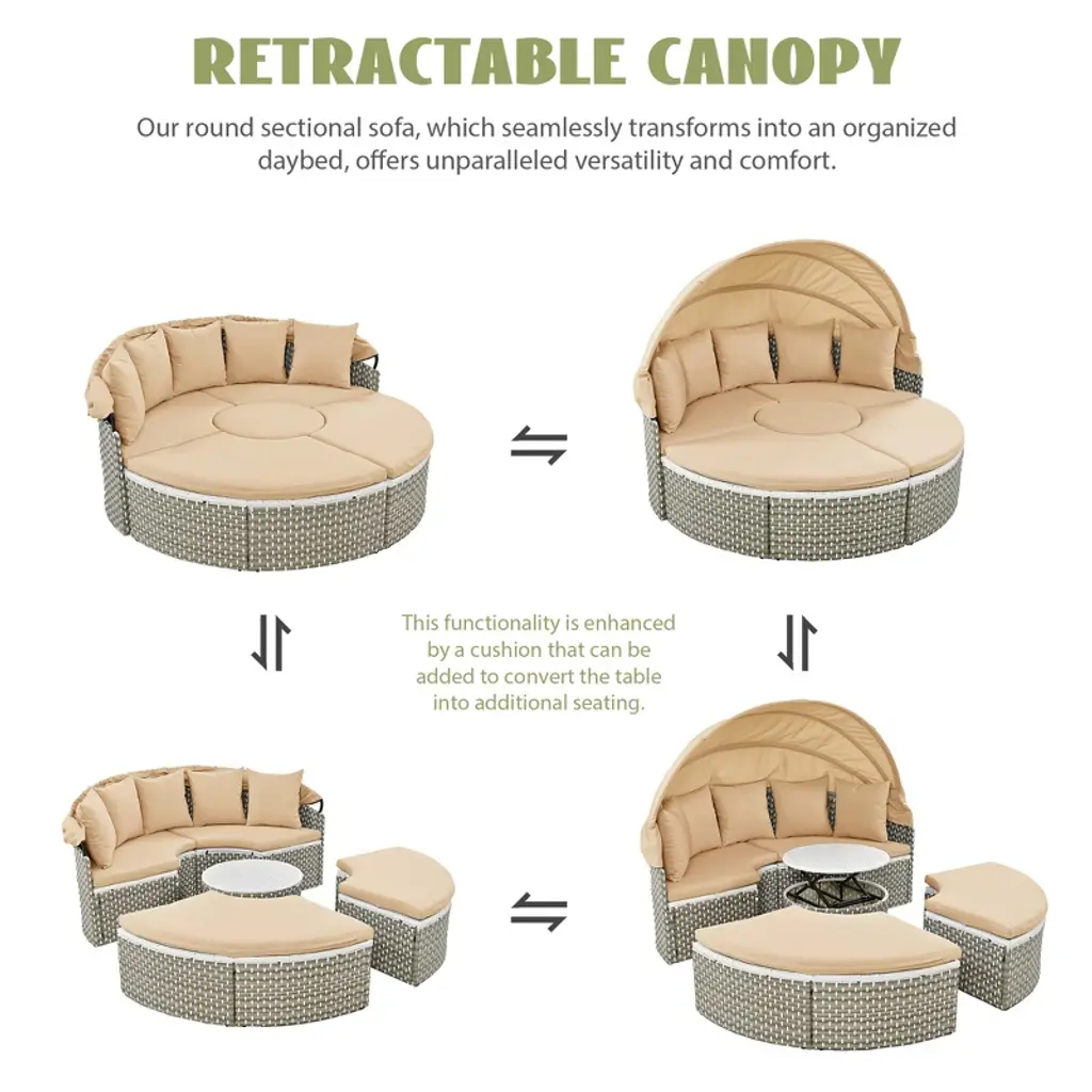 Elevate your outdoor living with our All-Weather PE Rattan Daybed, a stylish and durable addition to any outdoor space. This beautifully crafted daybed features a robust metal frame and high-quality PE rattan weave, designed to withstand all weather conditions while maintaining its elegant appearance. The round sectional sofa seamlessly transforms into an organized daybed, complete with a retractable canopy for sun or shade.The adjustable table can be raised or lowered to suit your needs, and even converts into additional seating with a cushion.With five foam-filled pillows and cushions, washable covers, and adjustable feet, this daybed offers unmatched comfort and easy maintenance.Choose from two colors to enhance your outdoor space.