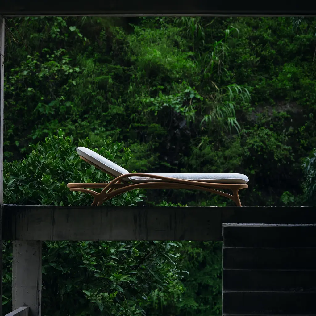 Rooted in the meditative essence of nature, the Zen Outdoor Adjustable Lounger from Ethnicraft is designed to be a sanctuary for stillness. This beautiful lounger is defined by its solid teak frame, with a flowing, organic form inspired by the shapes of roots, vines, and branches. A unique, patterned metal backrest adds a subtle touch of ornamentation, while a thick, comfortable cushion with a quick-dry core invites you to pause and unwind. A fusion of sculptural form and premium, all-weather materials, it brings a sense of effortless grace to any outdoor space. Highlights: