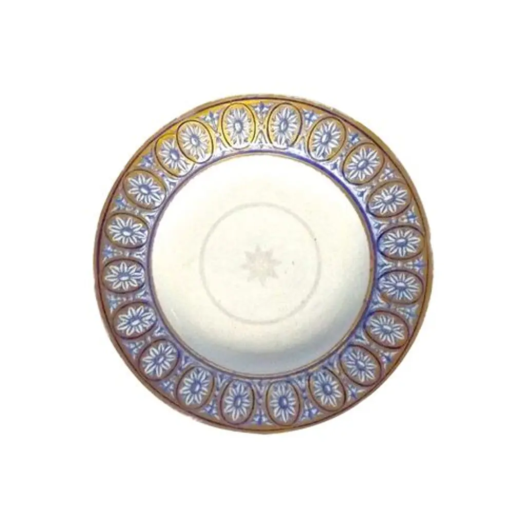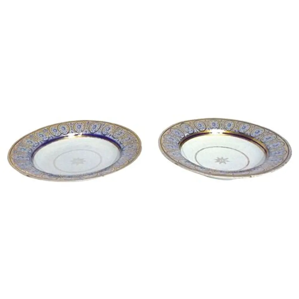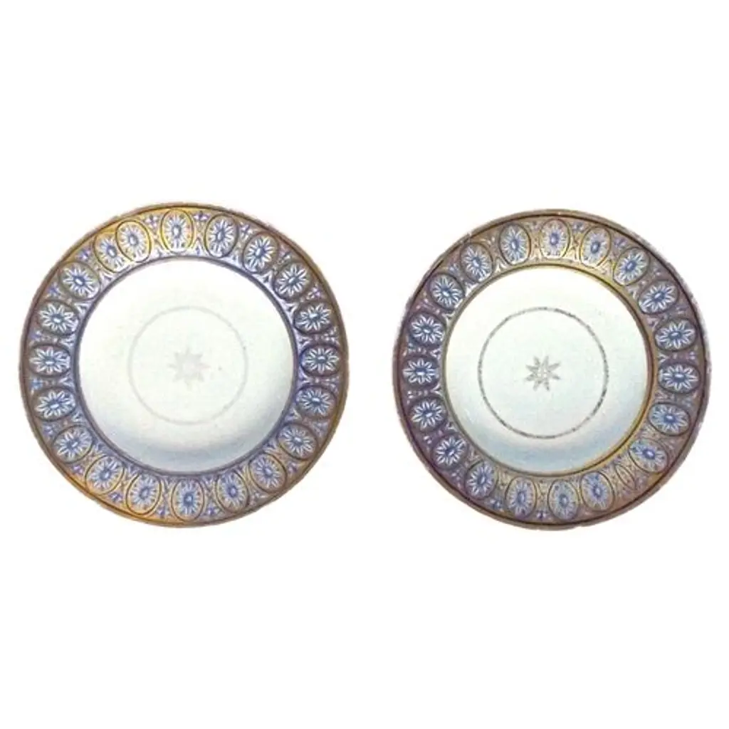 Pair of 18th-century porcelain gilt star medallion bowls. Worn star design in the center is surrounded by perimeter frieze design of gilt stylized starburst medallions. No maker's mark. For decorative use only. Faded and worn gilt.