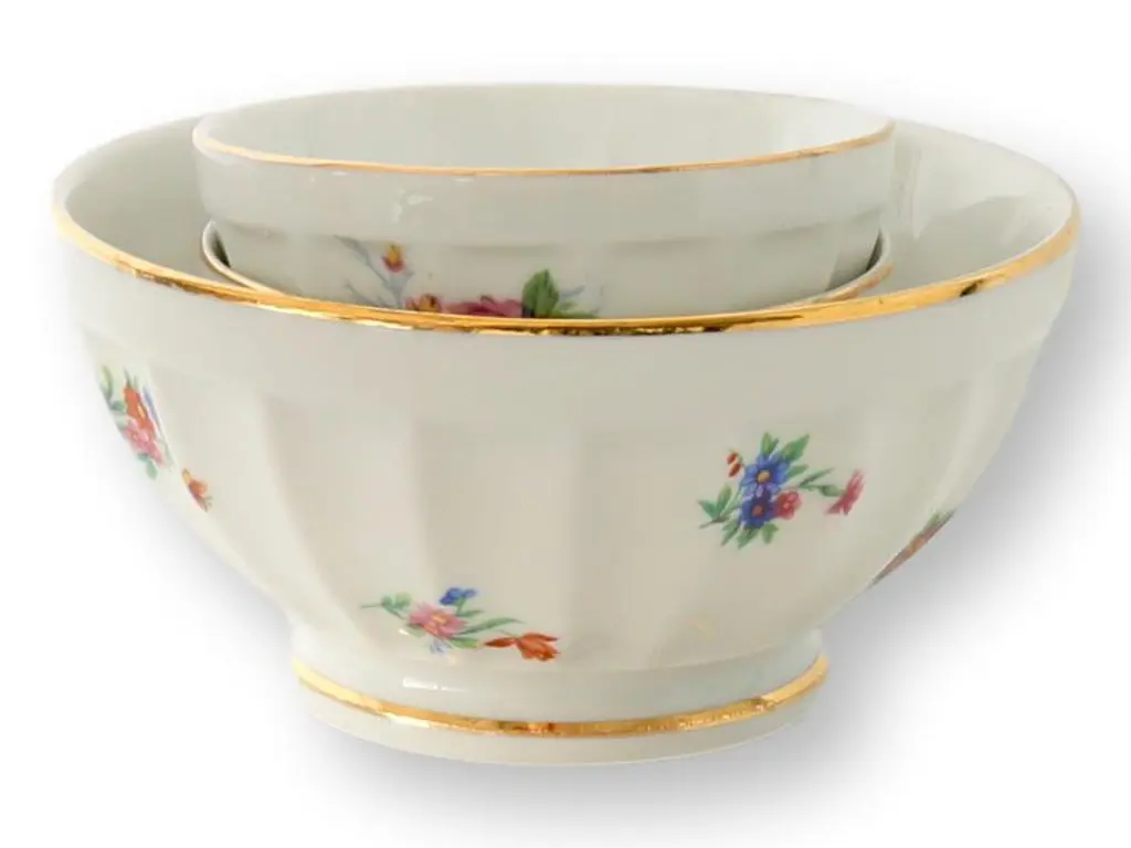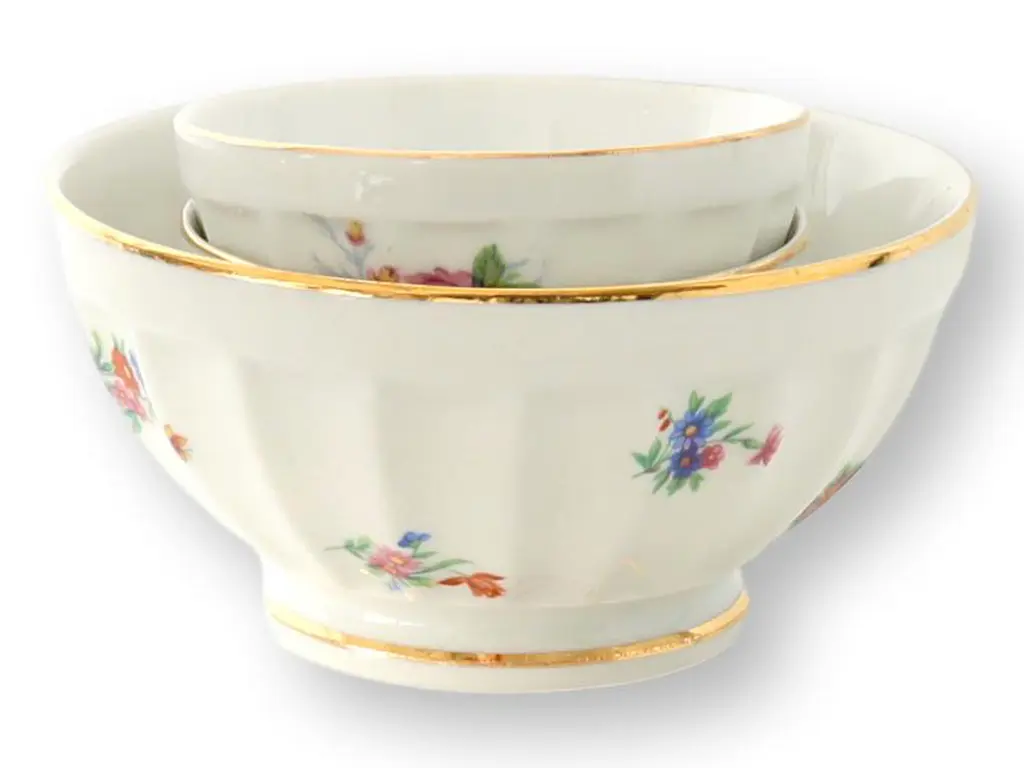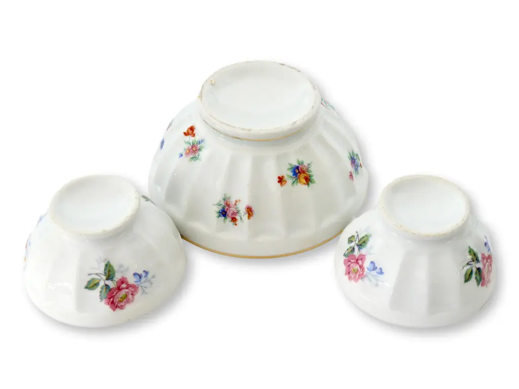 Dimensions: bowl, 5"Dia x 2.5"H; 2 small bowls, 3.5"Dia x 2"H. No maker's mark.