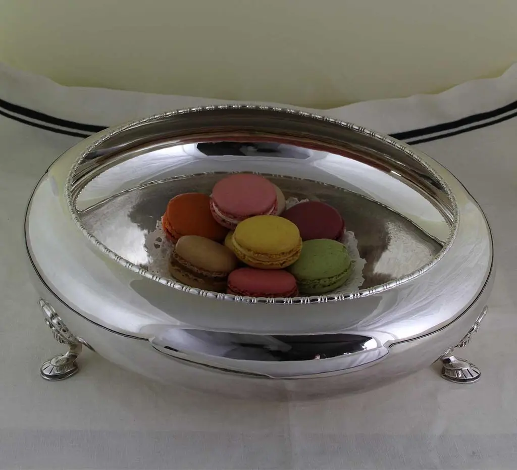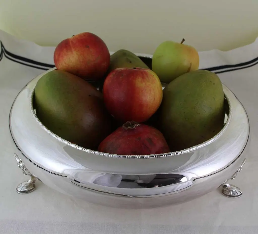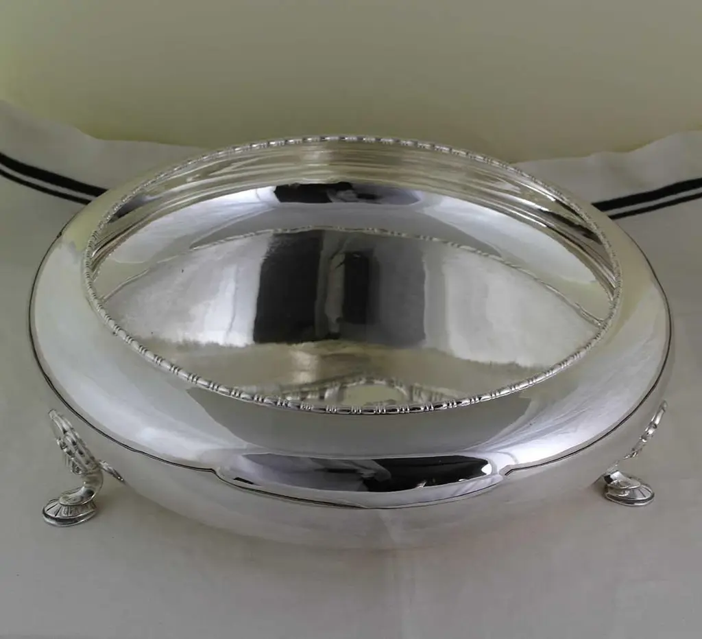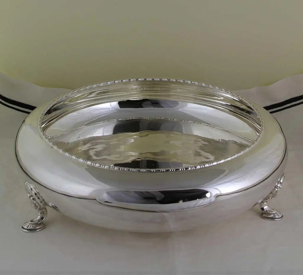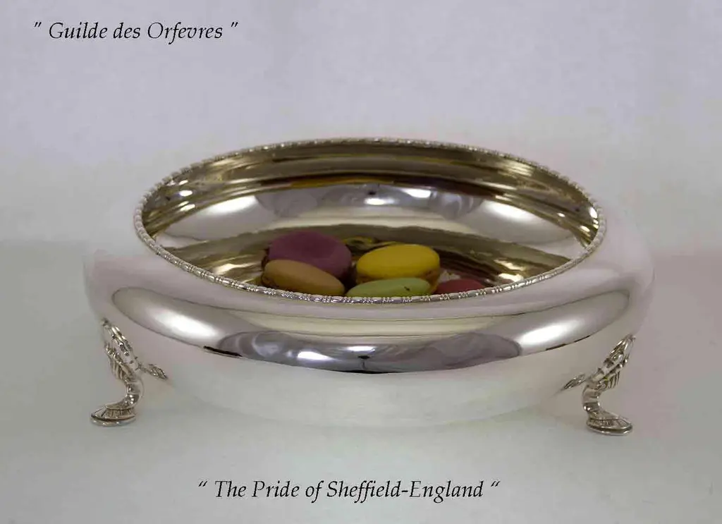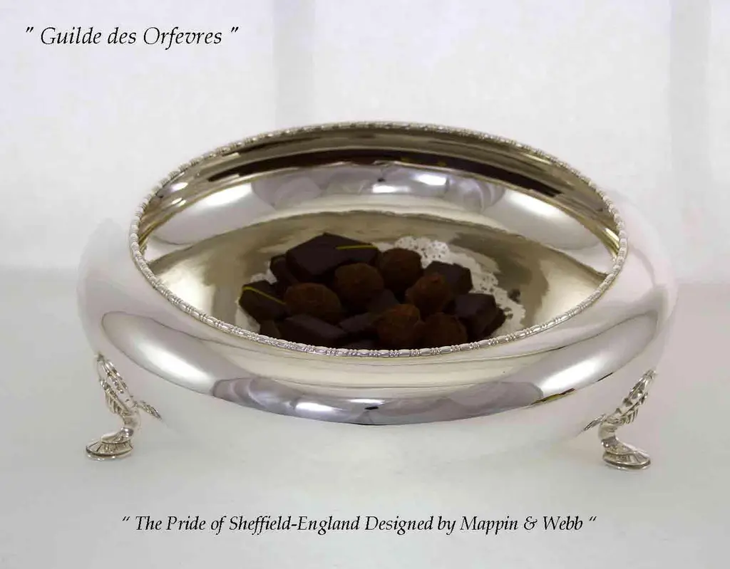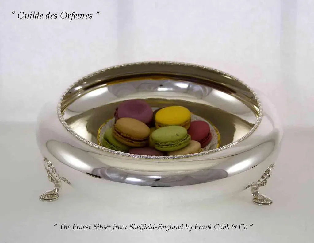 Ref # FC 15610 Photo-248 Description: Wonderful Silver Centerpiece with Egg & Bead on Feet Pattern : Egg & Bead - Size : 10 in. This Wonderful Bowl was an Exclusive Mappin & Webb Design, Ideal for Flower Arrangement Ideal to Entertain Family & Guest in Style. Electro Plated on E.P.N.S. , a quality silver plated on Nickel Silver Made in England, by Frank Cobb Marked : Frank Cobb, A 1 Retail Price : $ 1,295.00 Wholesale : $ 760.00 A 1 is a quality silver plated required by the Consumer Protection Agency in the U.K. A heavy silver deposit Crafted to last for a lifetime everyday use. N.B. Frank Cobb, a distinguished silver company in Sheffield , England; supplier of finest stores in the U.K such as, Mappin & Webb, Garrard's etc... and abroad. Silver is Eternal, the Silver Glow & Patina is agreeable to the Eye. Quality Silver & Sterling Silver are Heirloom, will be Enjoyed & Treasured from Generation to Generation. “. The Story Behind These Magnificent & Exceptional Sheffield Plate Items is Fascinating : Purchased directly from the Silver Manufactures in London, Sheffield & Birmingham-England in 1970's. They are in the original factory packaging, were at a storage in Greenwich, CT for almost forty (40) years. They surfaced to the market when most of the manufacturers are now defunct!? “ They Are Not Available Anywhere Else Condition : New - Factory Original Packaging.