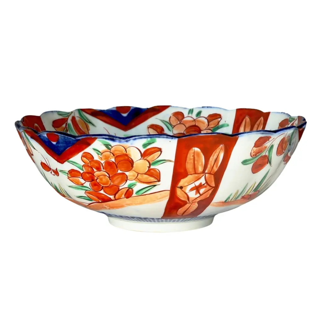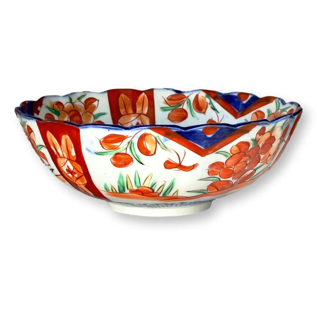 Beautifully hand-painted, this 19th-century Japanese Imari porcelain bowl showcases vivid hues of red, blue, and green in floral and geometric motifs. Its scalloped edge adds elegance to its intricate design, reflecting the artistry of Edo-period craftsmanship. Perfect as a display piece or functional decor, this antique bowl captures the timeless beauty of Japanese tradition. As with most early Imari, there is not a maker's/artist mark.