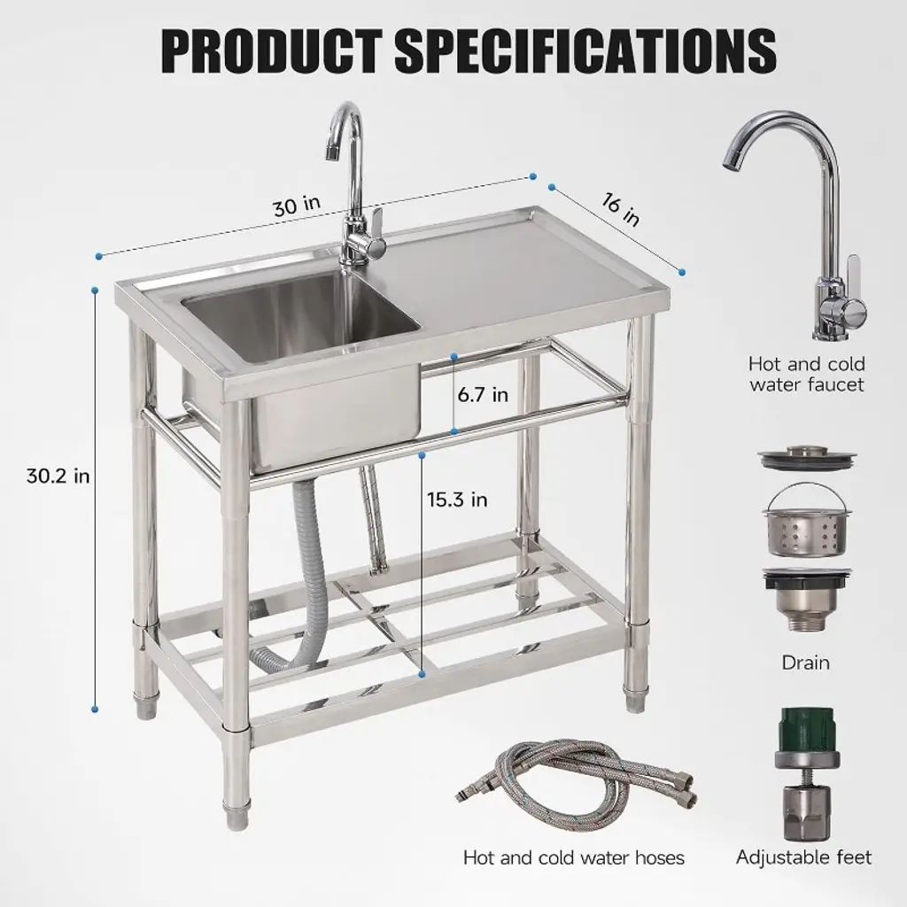 30" Stainless Steel Commercial Utility Sink, Freestanding Single Bowl Kitchen Sink Set With Cold And Hot Water Pipe, Workbench, Undershelf