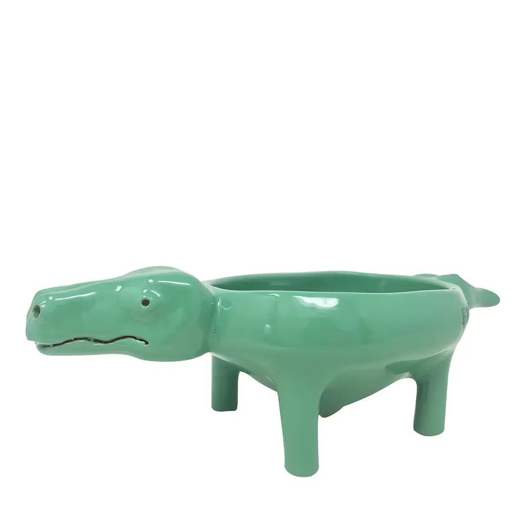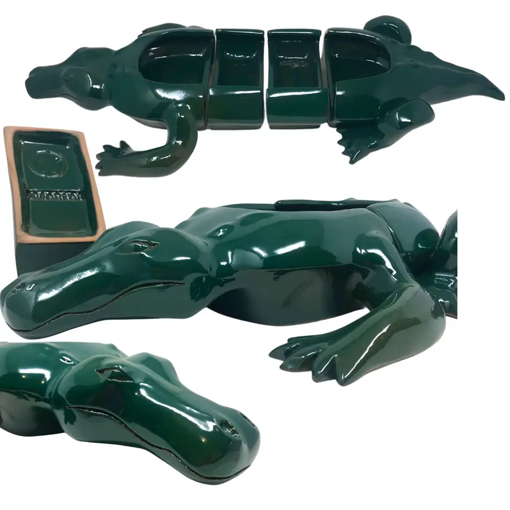 This playful crocodile-shaped bowl can be effortlessly included in a kitchenware set or can be used as an empty-pocket tray or soap holder in an eclectic bathroom. Lacquered in a dark green shade, its handcrafted ceramic body is divisible in four parts. Customizable in color upon request to the Concierge. Due to its handcrafted nature, no two pieces are alike and any differences from the pictured item are to be expected and treasured.