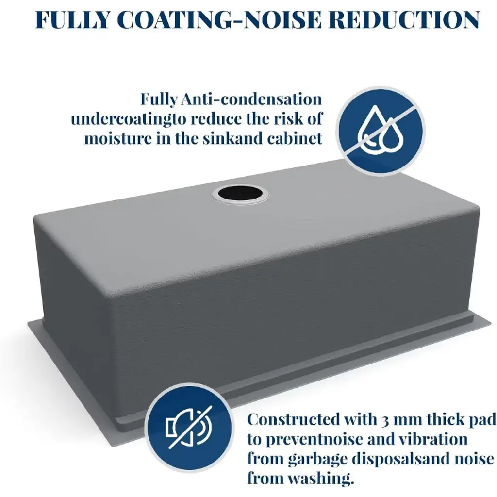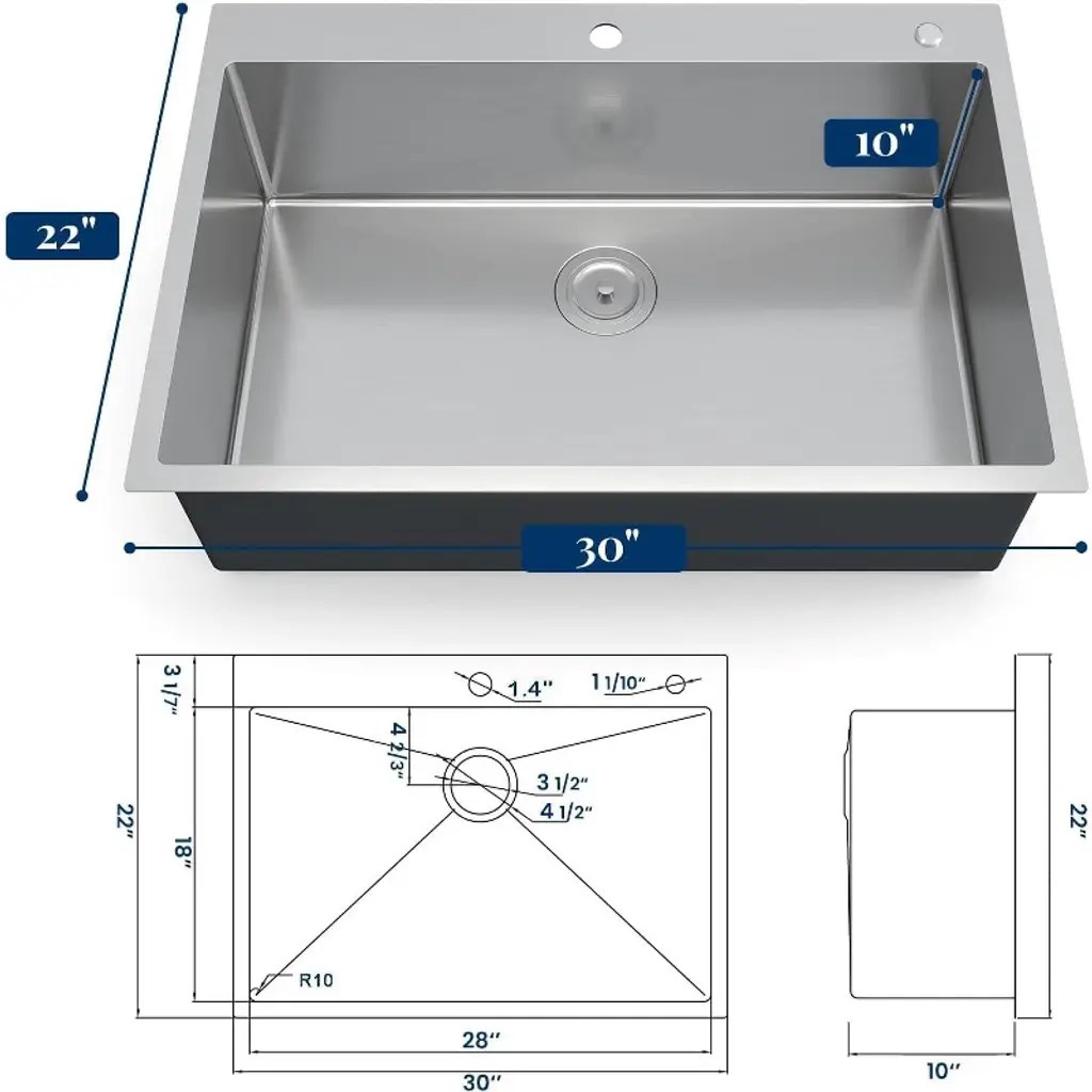 The Acekool 30"x22" drop-in kitchen workstation sink offers a spacious single bowl ideal for busy kitchens, combining style and function with durable construction. Its 16-gauge stainless steel provides scratch resistance and longevity, while the optimized drainage and soundproofing enhance everyday use. The flush topmount design integrates smoothly with countertops. With exterior dimensions of 30" L x 22" W and a 10" deep bowl, plus six included accessories, this sink supports meal prep and cleanup in one efficient workstation.