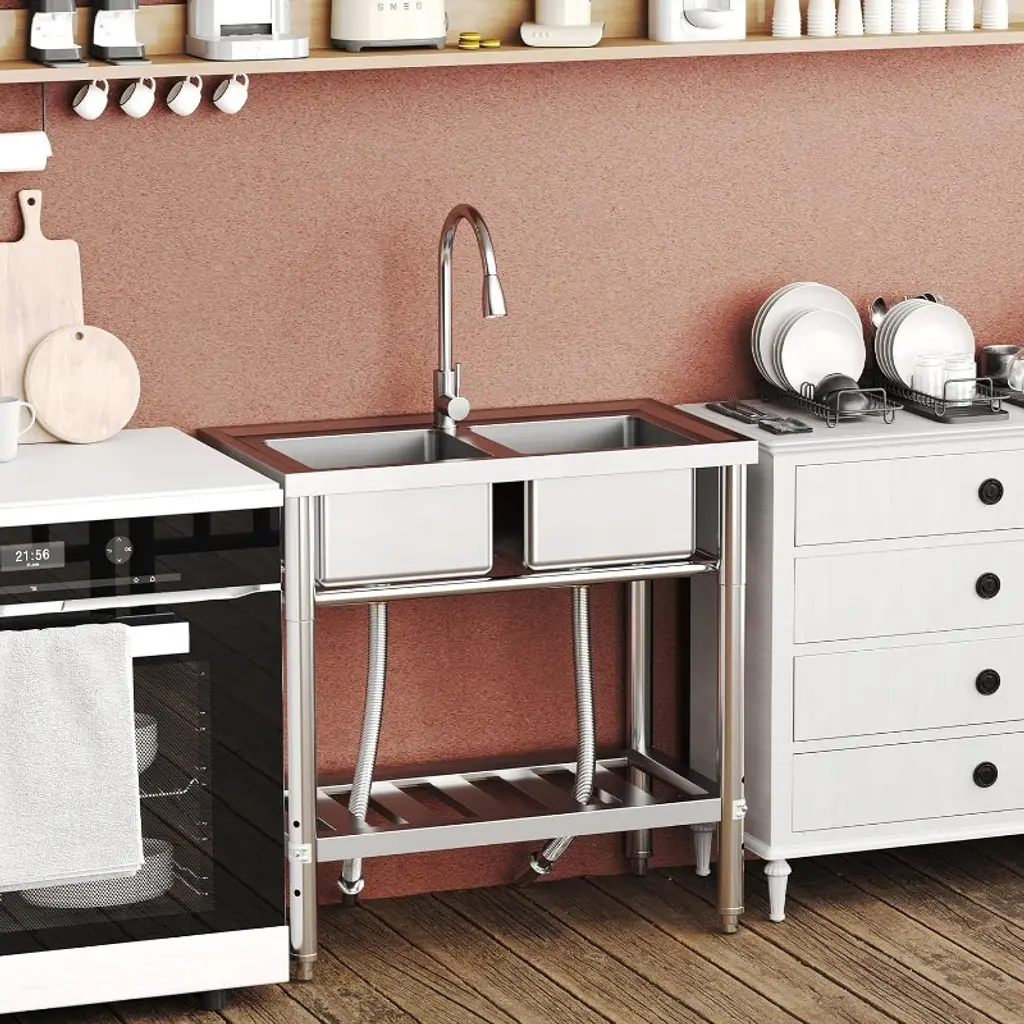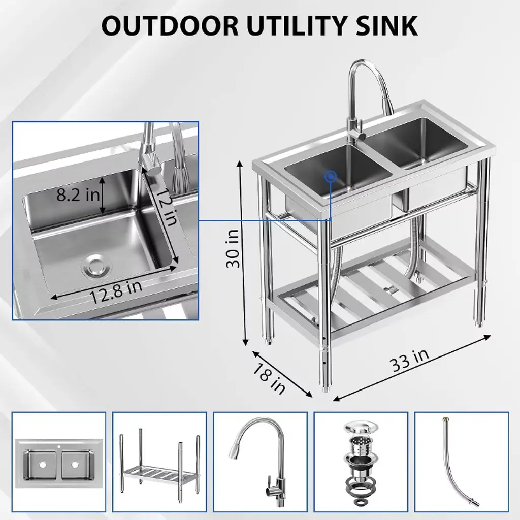 Acekool Stainless Steel Double Bowl Utility Sink, 33"x18"x30" With Storage, Hot & Cold 360° Faucet, For Garage, Restaurant, Backyard