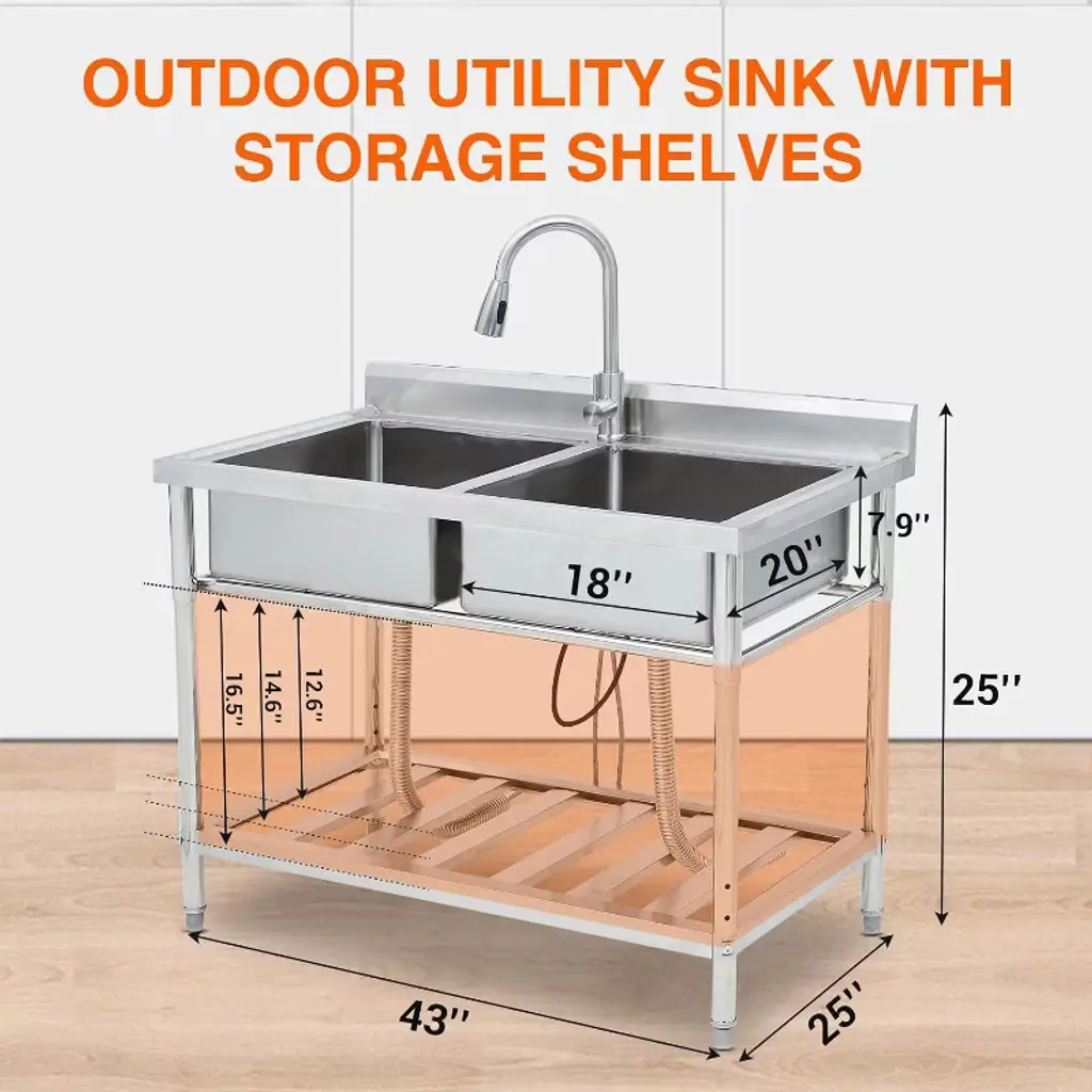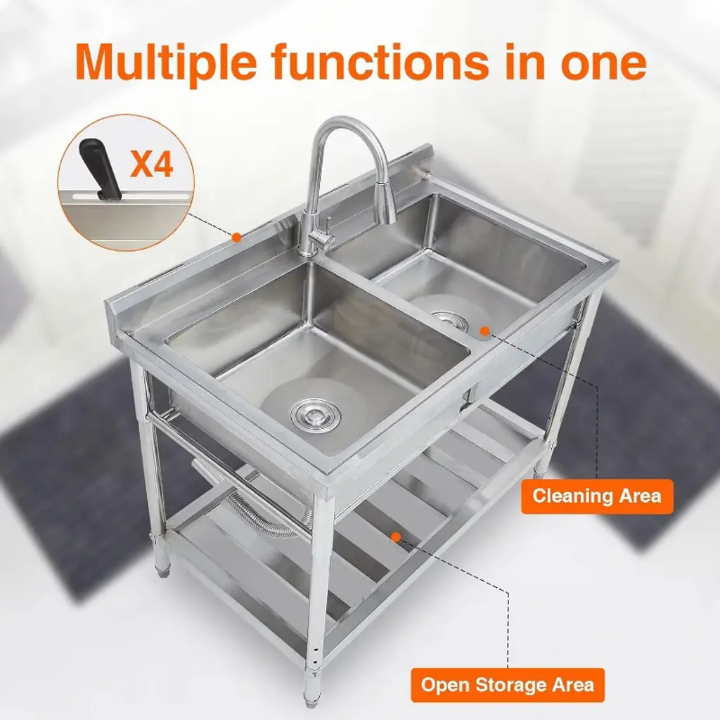 Acekool Stainless Steel Double Bowl Utility Sink, 43"x25"x35" With Storage, Hot & Cold 360° Faucet, For Garage, Restaurant, Backyard