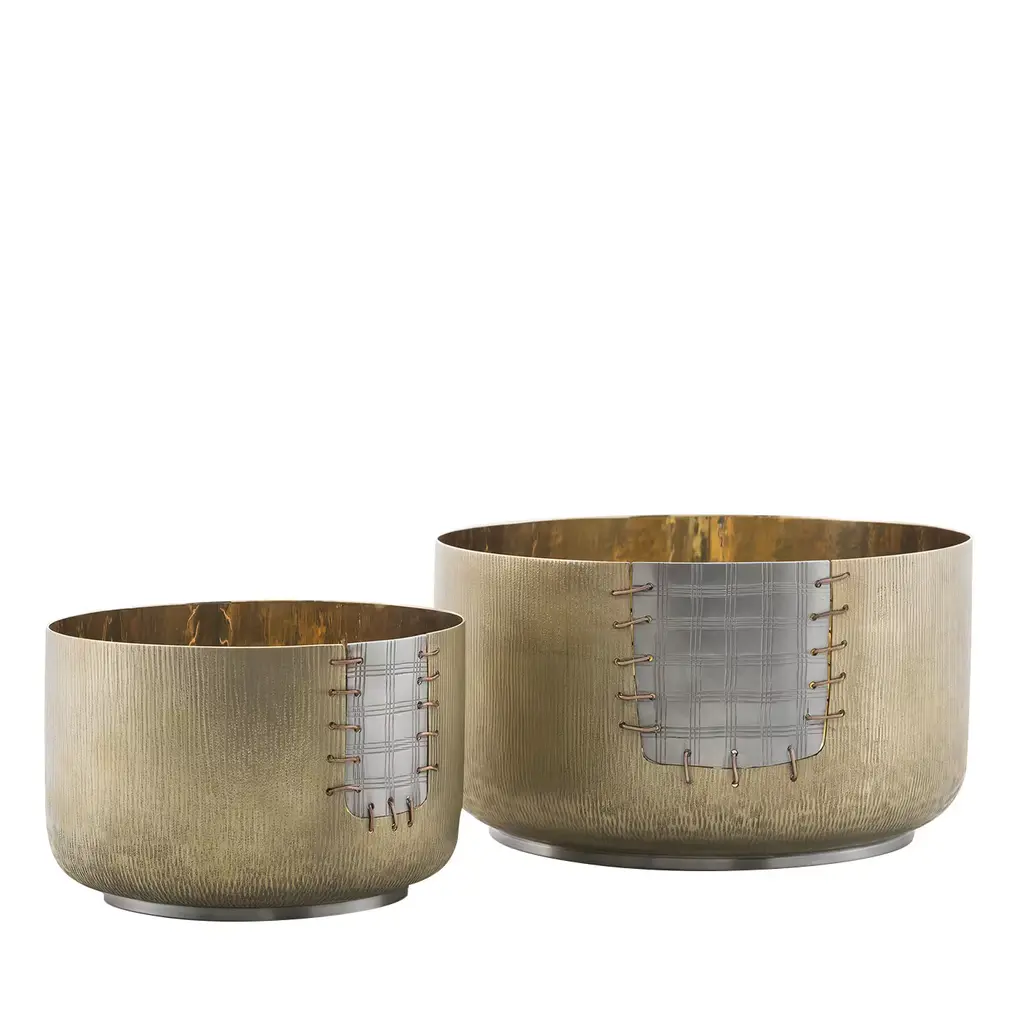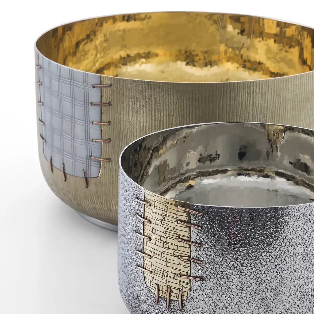 This bowl is a versatile and striking addition to any modern home where, both as a vase or a centerpiece, it will make a statement. Its simple silhouette is adorned with a decorative patch that seems to have been sewn on it. Part of a limited series, the copper, white bronze, and brass used reflect the surrounding light in a unique way, while the patch symbolizes the quest to repair and not throw away broken objects, according to the Japanese philosophy of Kintsugi.