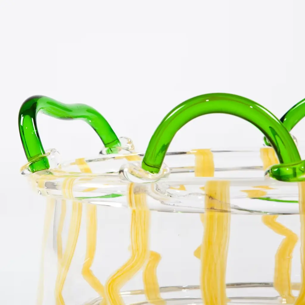 This striking fruit bowl was designed in 1983 by Ettore Sottsass. The tapering cylindrical silhouette made of glass features three handles and a transparent body decorated with yellow vertical lines, exquisitely rendering the soft consistency of fabric. Versatile and unique, this stunning object of functional decor can be showcased on a table as a centerpiece or on a mantlepiece as sculptural decoration. Both dimensions and colors might slightly vary because of the handcrafting nature of its production.