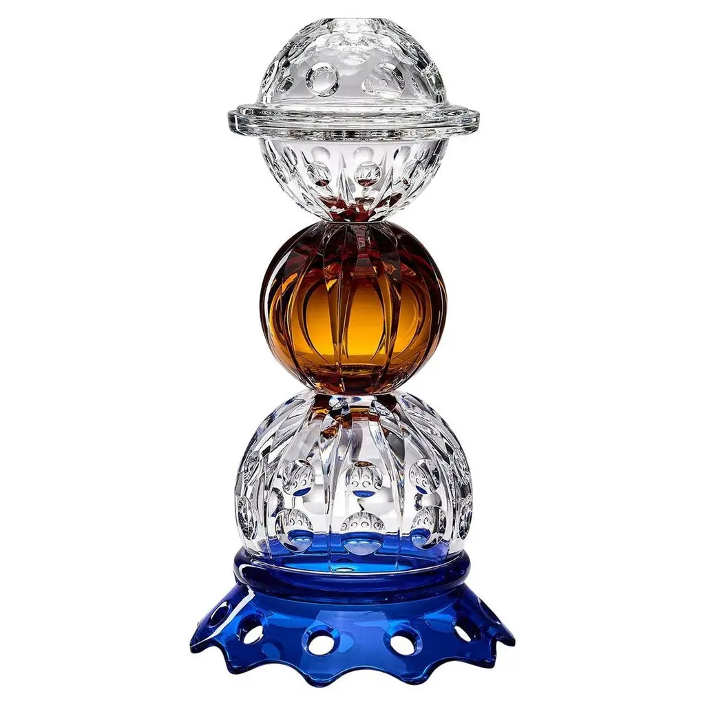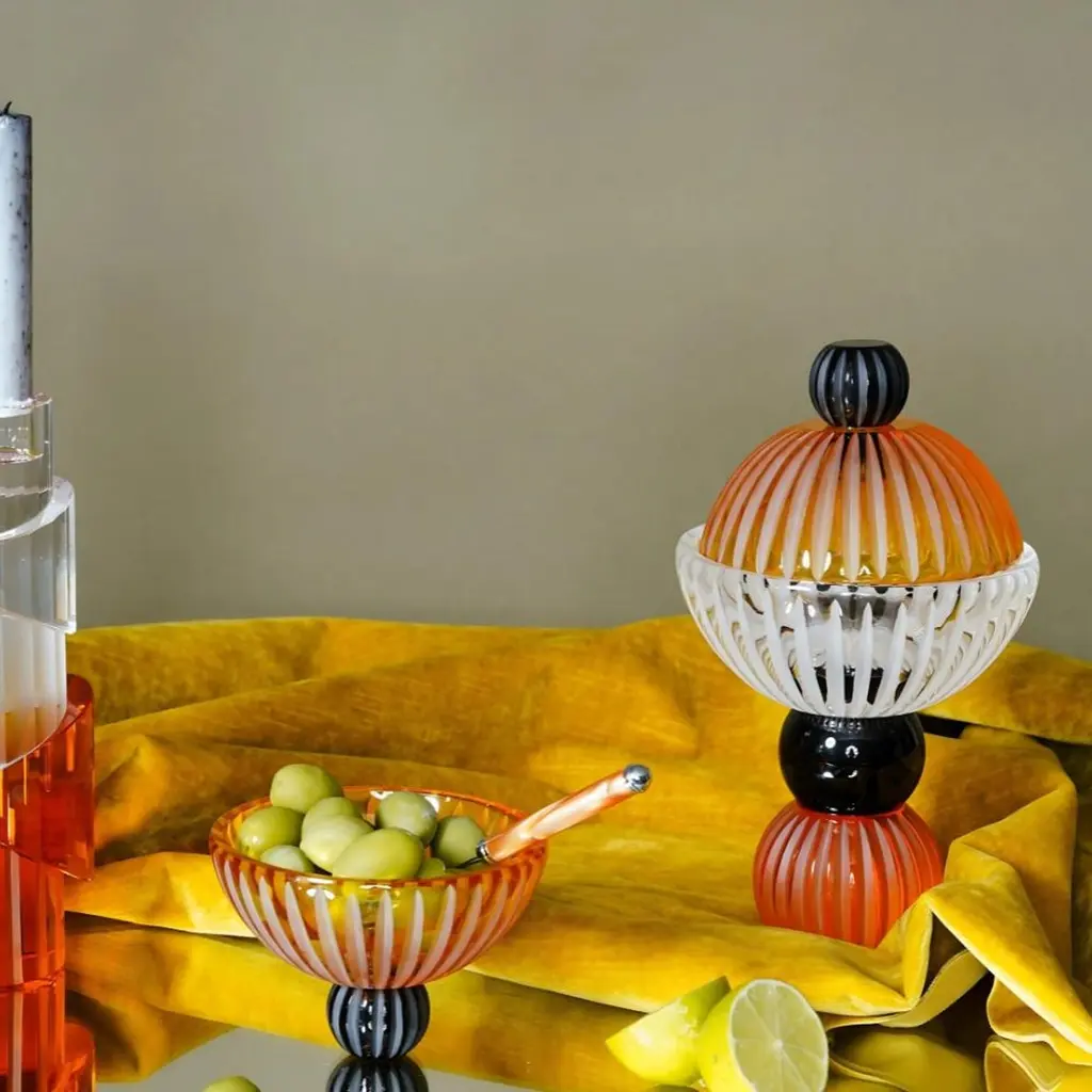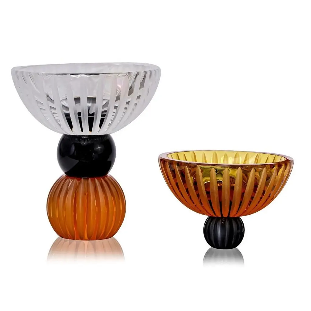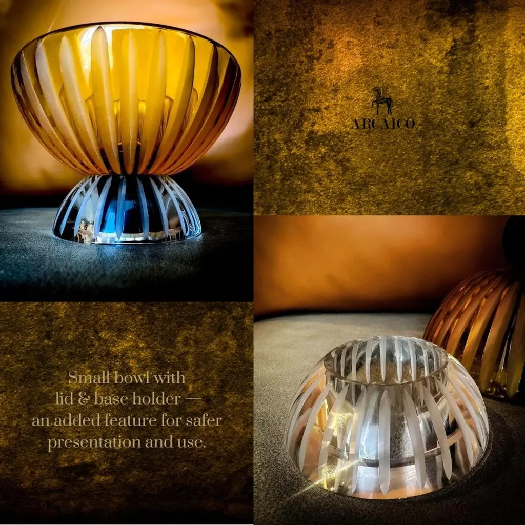 The Ambrosiá Footed Crystal Bowl Set is a Multifunctional Luxury Serveware.It is a handcrafted, collectible centerpiece that beautifully merges vintage charm with modern versatility. Made from amber, black, and clear hand-cut crystal, its Art Deco-inspired design effortlessly transforms into two separate bowls or into a covered serving dish, ideal for elegant entertaining.This 4-piece luxury crystal bowl set includes:Two sculptural crystal bowls : footed bowl and small / lid bowl,A base holder for small/lid bowl,And a sleek 18/10 stainless steel Italian-made spoon.Perfectly suited for use as a caviar bowl, bonbonniere, nut dish, or condiment server, the Ambrosiá is both functional tableware and a statement décor object. Its European craftsmanship and mid-century modern elegance make it a highly giftable and rare designer collectible—ideal for those who appreciate fine serveware, vintage crystal, and geometric sculptural home accessories.