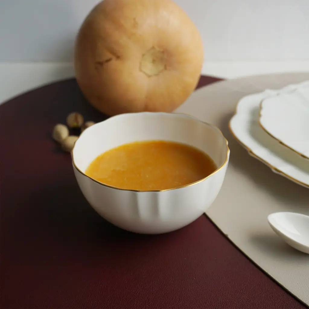 Timeless and fresh, the Amelie Brushed Gold Collection features creamy dinnerware with intricate scallops and delicate gold trim.