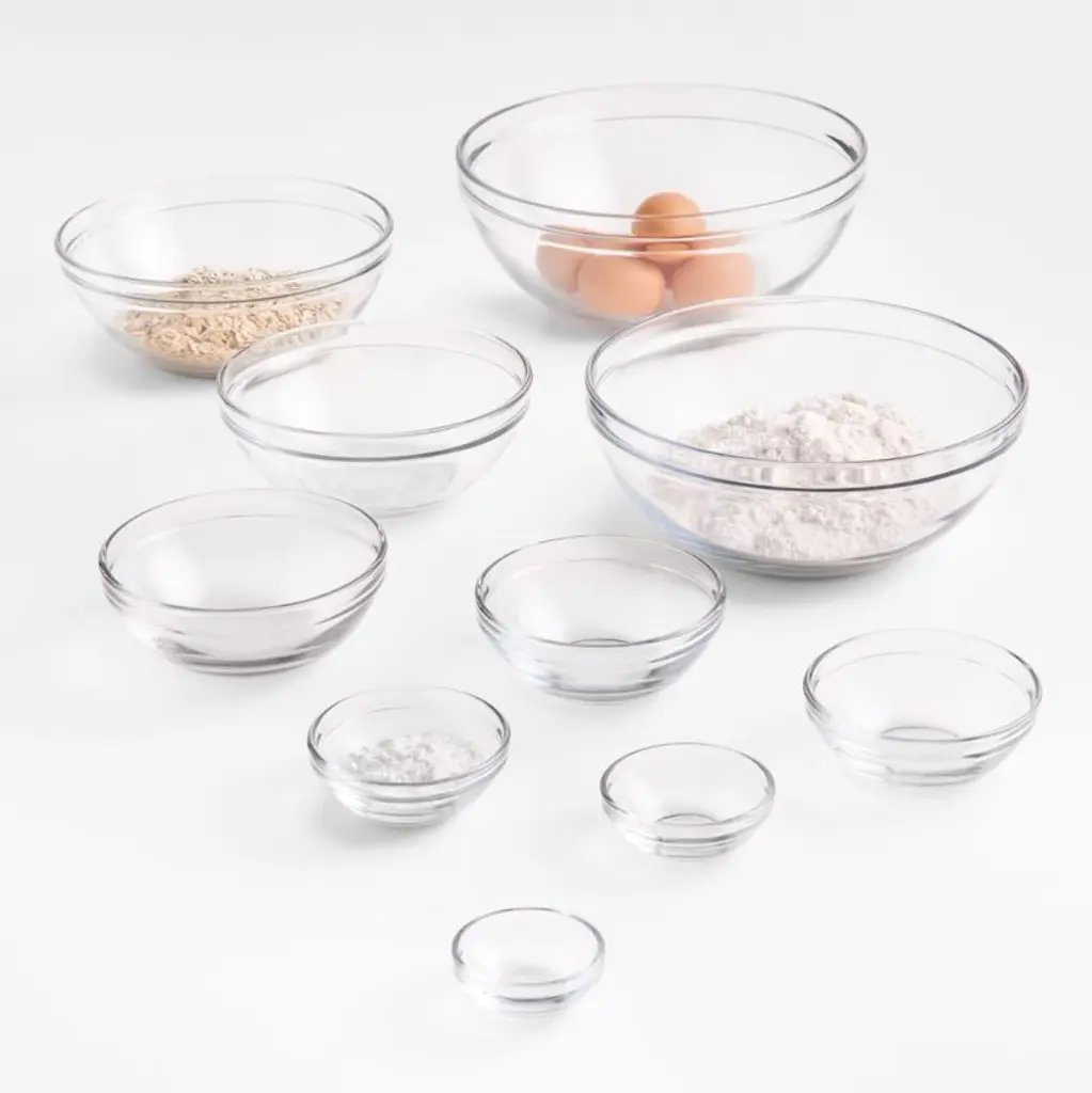 A kitchen classic, this 10-piece set of clear glass bowls addresses every kitchen need. The smallest bowl is perfect for an egg yolk or a salt-and-pepper mix for seasoning. Turn to the largest bowl for mixing dough or tossing salads. And there are eight more sizes in between to make mixing, prepping and serving a breeze. We love the broad-rim detailing and the way the bowls nest neatly for space-saving storage. Upgrade your mixing bowl options, or box the set up as a sure-to-be-treasured graduation, housewarming or shower gift.Anchor Hocking has been crafting high-quality glassware since 1905.