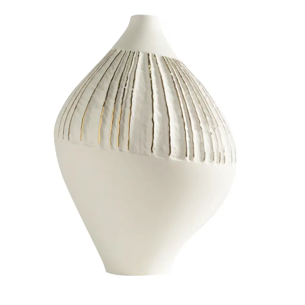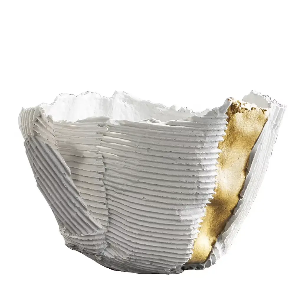 A striking work of art, this sculptural bowl is a testament to artistic innovation and craftsmanship. Entirely handmade of paper clay, this bowl has a conical silhouette with sloping edges and a wide, jagged mouth. The white clay surface boasts expressive horizontal and vertical ridges and a smooth gold panel insert, elegantly enhancing the dynamic color and textural contrasts. This bowl can be displayed alongside other pieces from the Anemone Collection for a glamorous look. Every one of Paola Paronetto’s creations is unique. Slight variations in shape, colour and size are to be considered a guarantee of authenticity and value. They are finished with non-toxic satin-finish enamels. Although very rarely, it is possible for them to leak after long periods of exposure to water. It is therefore advisable to test their water resistance before using them on delicate surfaces. They should not be used as dining utensils. The white pieces can be washed with water or sanitizing products, whereas the coloured pieces must be treated more gently and cleaned with a feather duster or a soft cloth, dry or moistened very slightly with water.