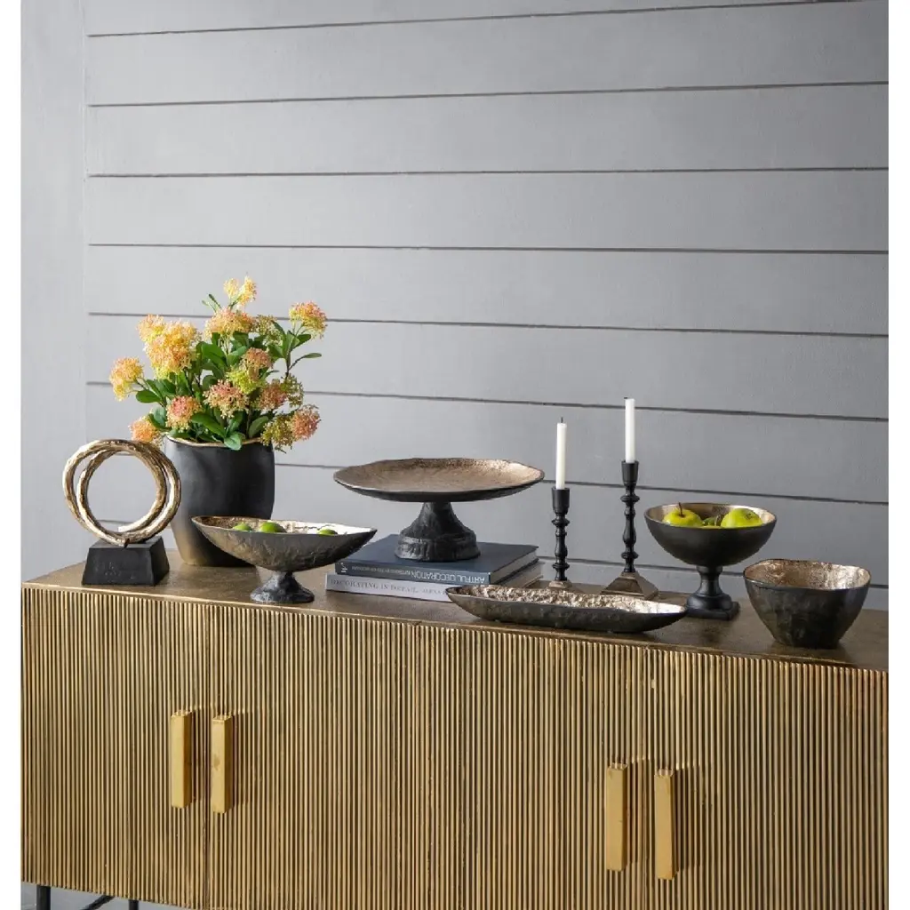 With its distinctive pedestal design, rich black and gold color combination, and solid aluminum construction, this decorative bowl will infuse your home decor with a burst of sophistication. An ideal size to adorn your kitchen island, tabletops, or sideboard, this piece will draw the eye whether it is filled with fresh fruit or colorful accents.