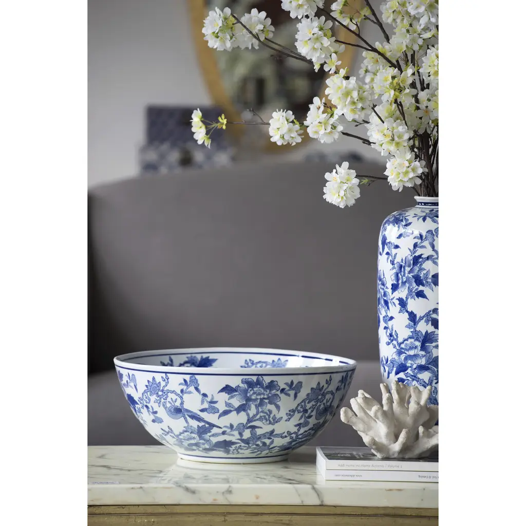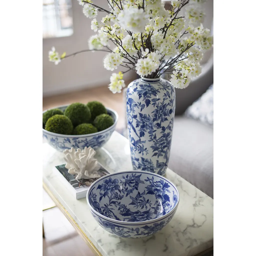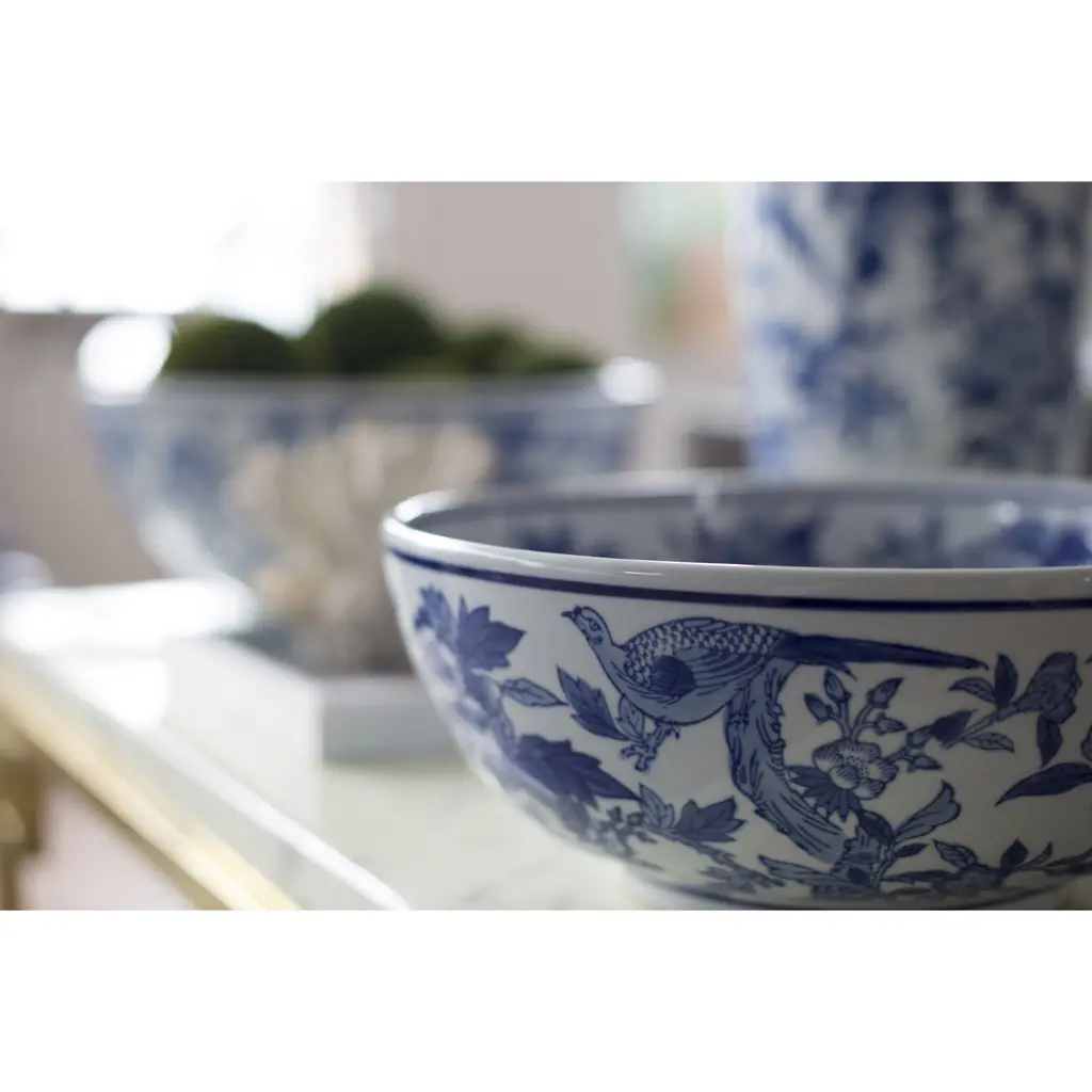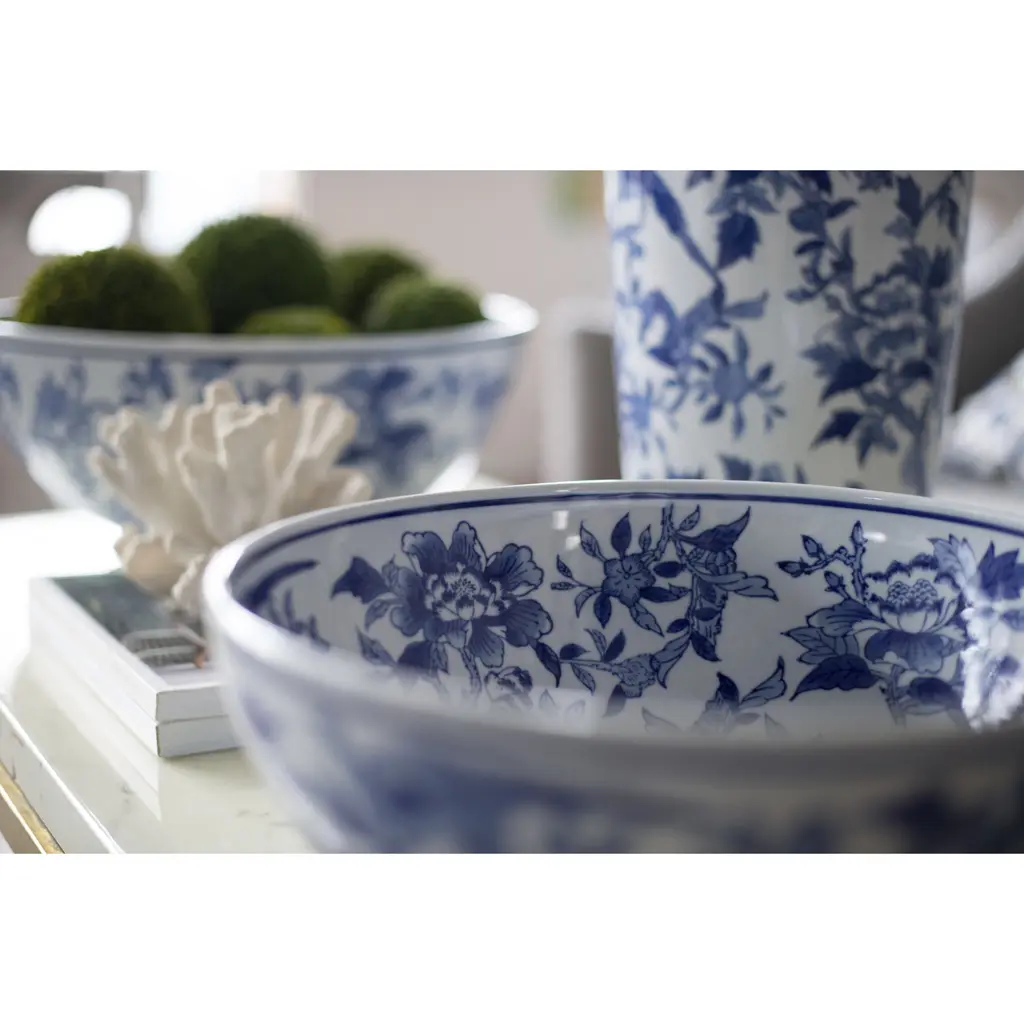Add a refined touch to your home or office with this set of two lavish ceramic bowls featuring an elegant floral and bird pattern. With the timeless combination of rich blues and crisp white, these decorative bowls infuse any space with classic sophistication. Use to hold jewelry or accessories, or display together as exquisite accents in a master bathroom, airy foyer, or opulent living room.