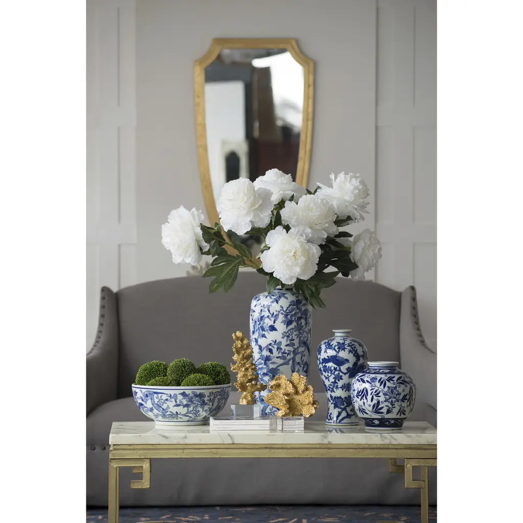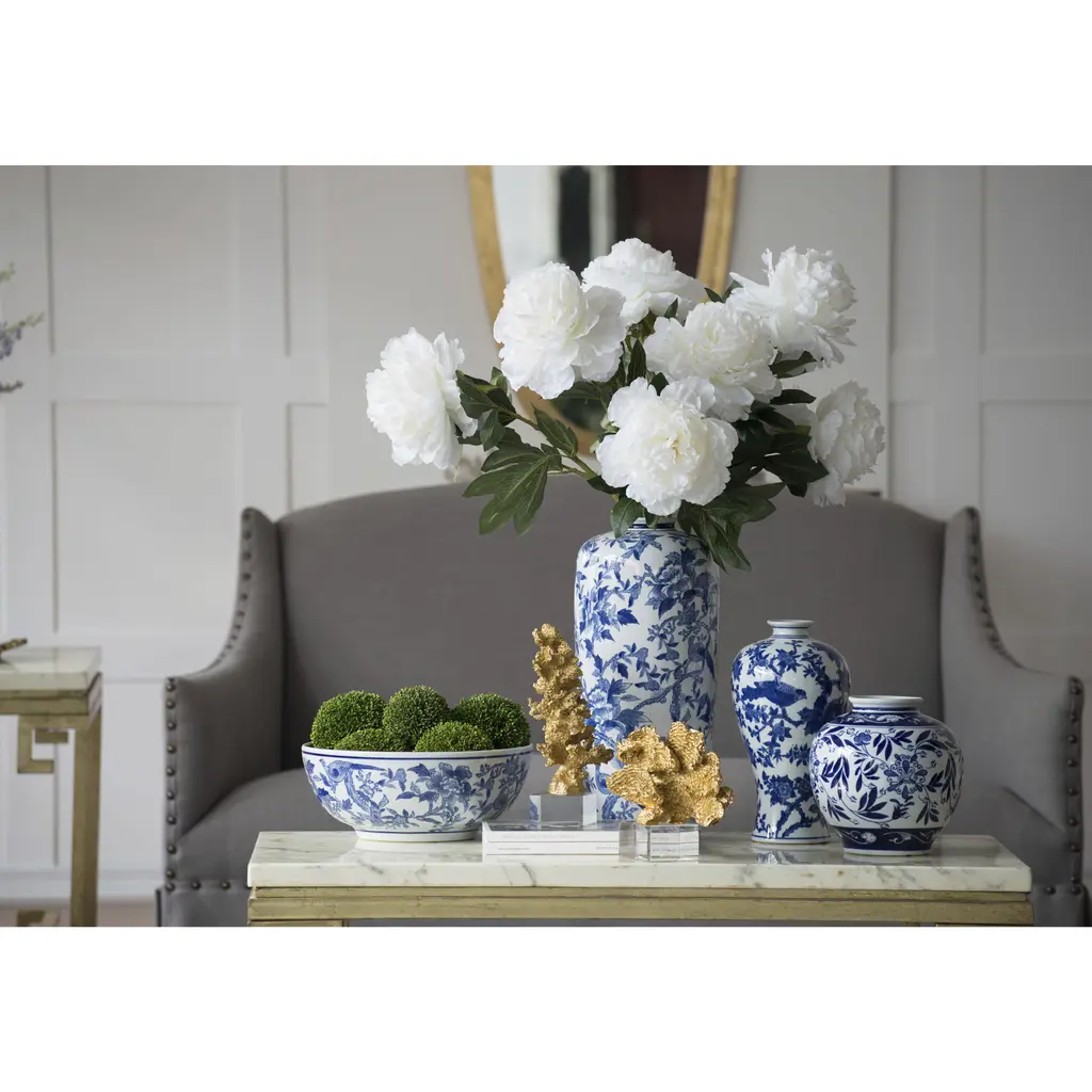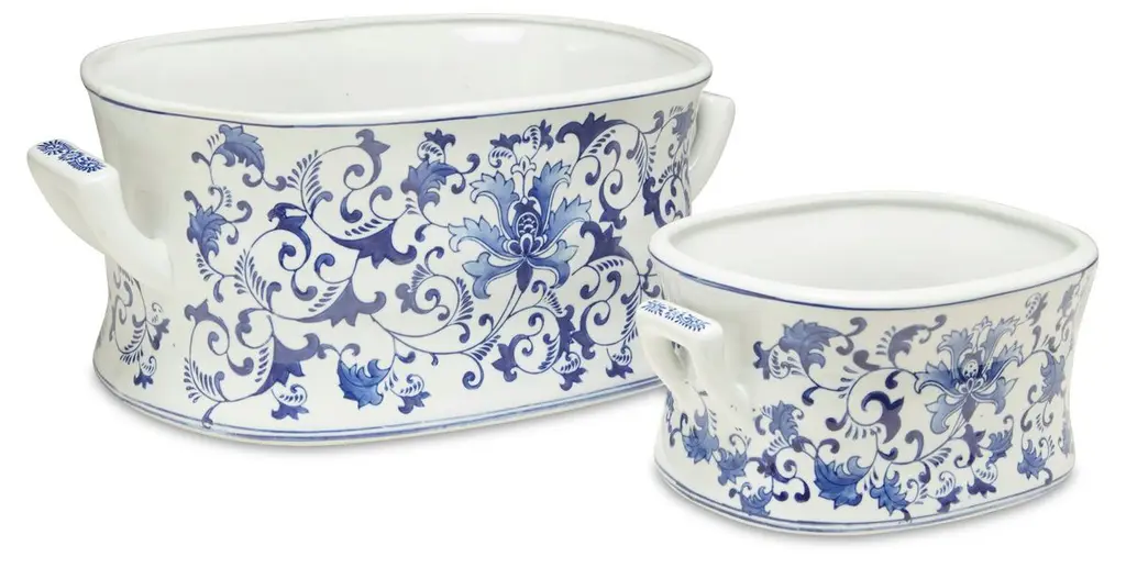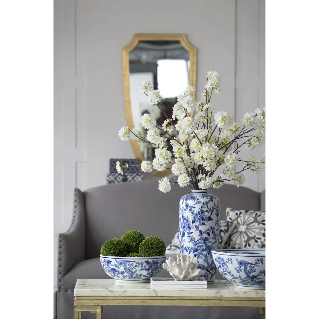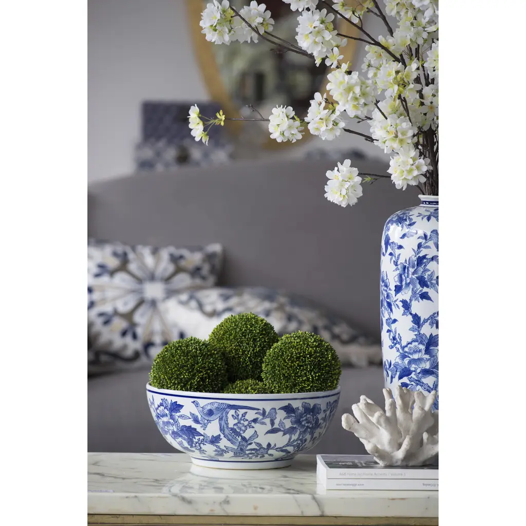 Add a refined touch to your home or office with this set of two lavish ceramic bowls featuring an elegant floral and bird pattern. With the timeless combination of rich blues and crisp white, these decorative bowls infuse any space with classic sophistication. Use to hold jewelry or accessories, or display together as exquisite accents in a master bathroom, airy foyer, or opulent living room.