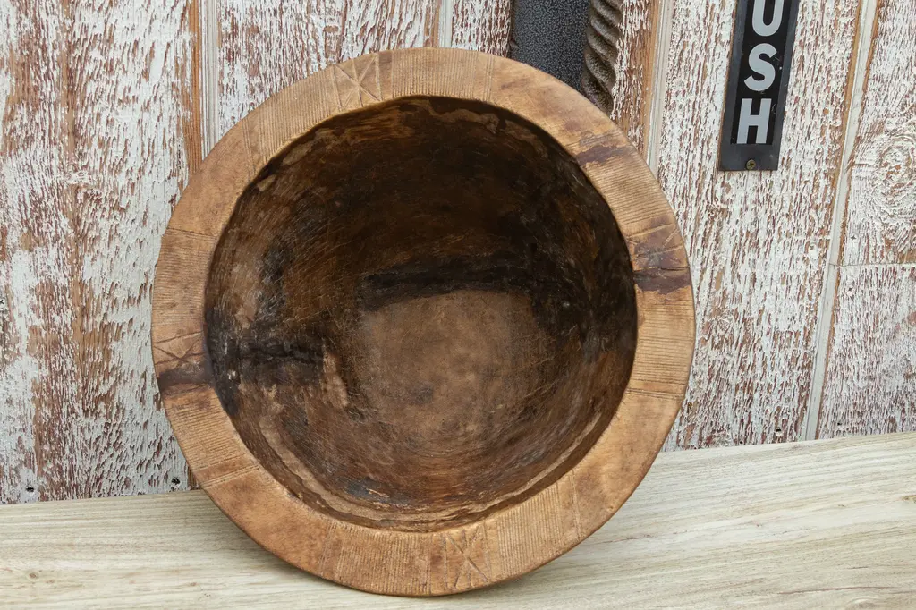 Hand-carved from single logs of indigenous hardwood in West Africa. The Tuareg community are a nomadic group traveling across the Saharan desert. Each bowl is unique featuring a fine decorative engraving with geometric lines or tribal design. These beautiful African bowls have a deep rounded shape and then have been used to transport and store milk and food. These bowls are authentic and will show wear, possible cracks.