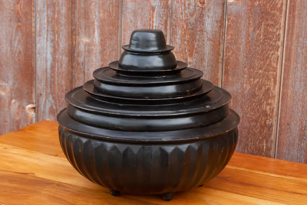 A late 19th century tiered black lacquered Monk offering bowl set. This offering set is made from bamboo in a black and red lacquered finish. This piece was originally used as compartmentalized food offering vessel to offer food to monks. This gorgeous vessel sits on a small feet.