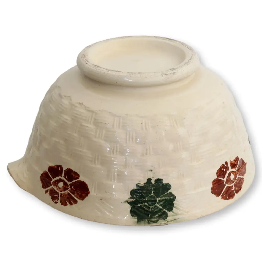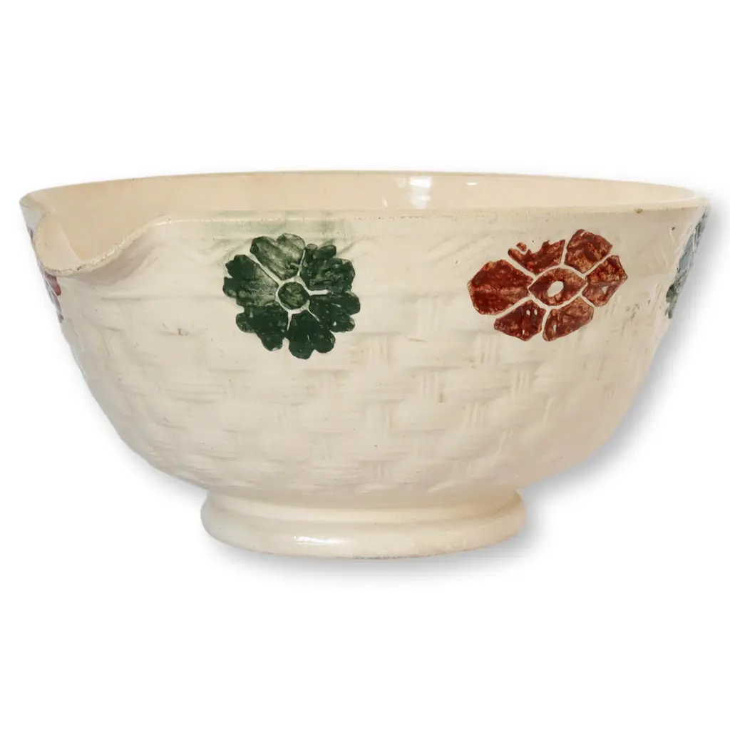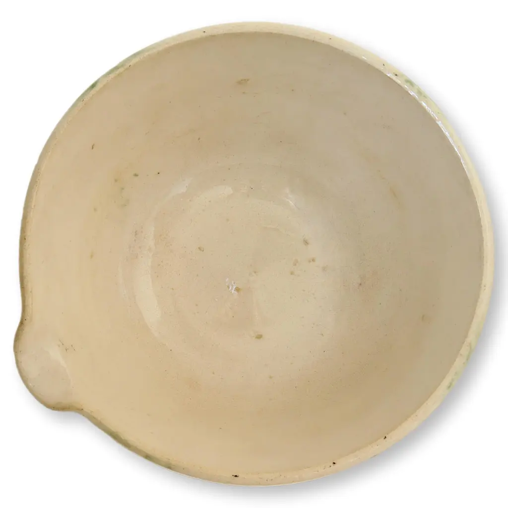 Antique English sponge ware medium size batter bowl. It does have some light discoloration inside, the base ceramic is tan in color. Glaze is good with fain crazing inside. Unsigned.