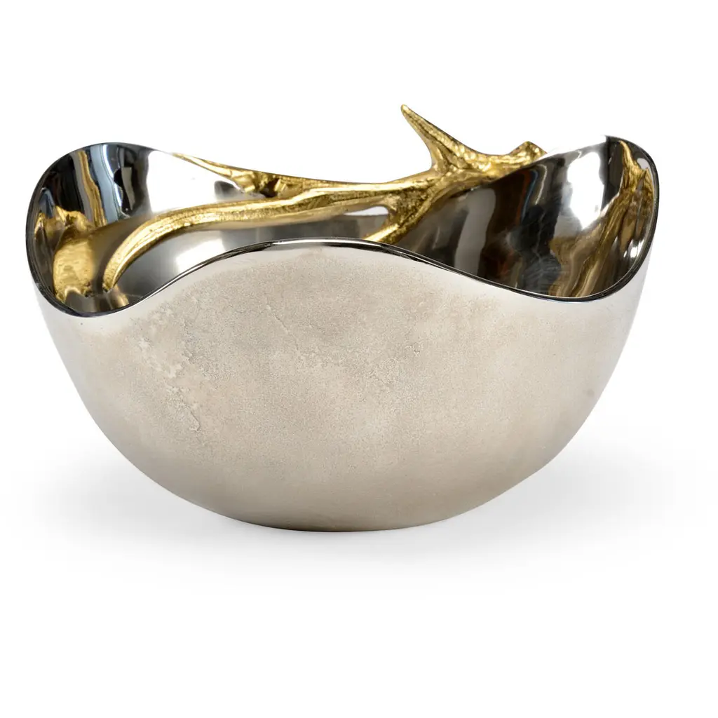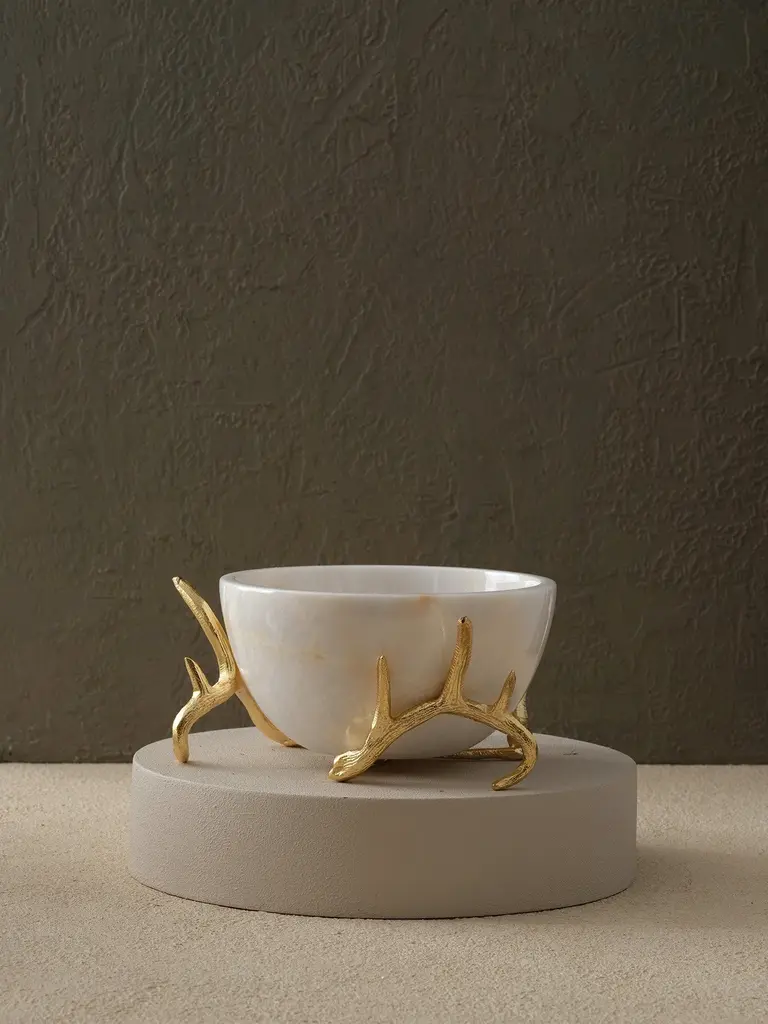 A fusion of raw nature and refined design, the Marble Bowl with Gold Antler Brass Stand makes a bold yet elegant statement. Crafted from solid white marble, the bowl rests atop a sculptural base of inverted antlers, cast in gleaming gold-toned brass. The contrast between the smooth, cool marble and the radiant metallic base creates a captivating visual tension—ideal for interiors that embrace modern luxury with a touch of the unexpected. Whether used as a serving piece or simply admired as a decorative object, this bowl elevates any surface with its artful presence.