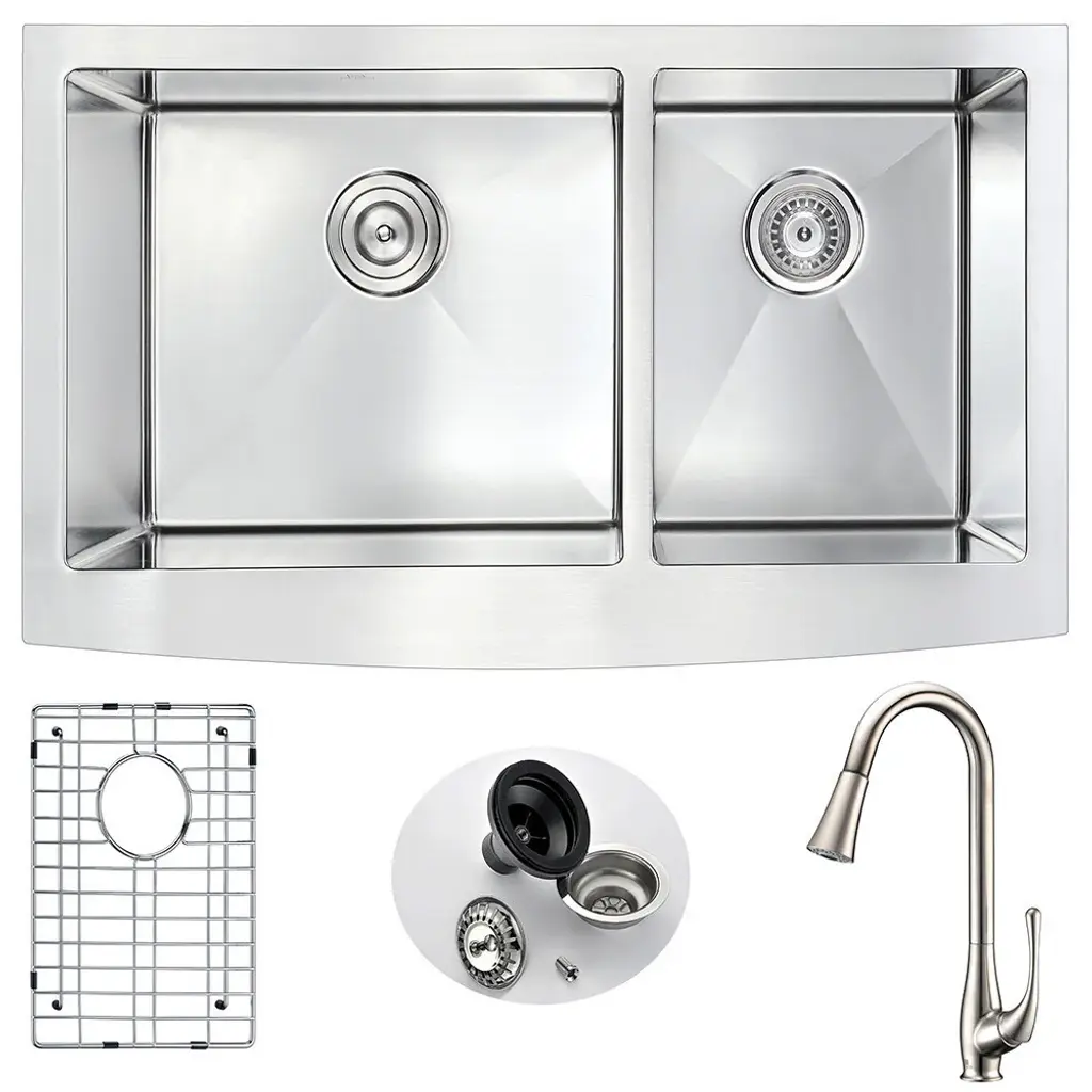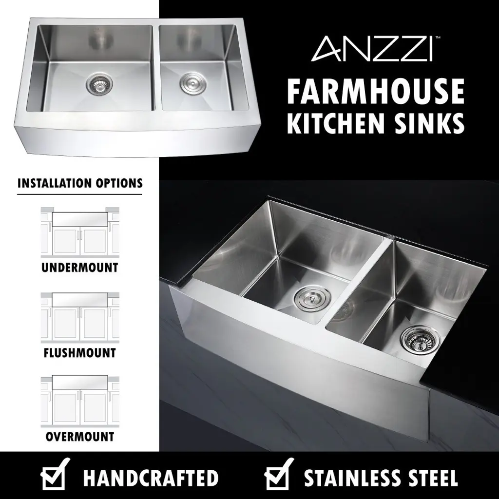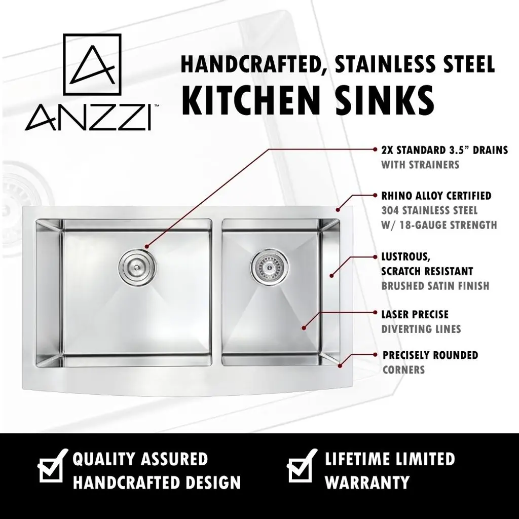 Improve productivity in your kitchen with this spacious double-bowl sink and faucet set. This Anzzi sink features hand-crafted European design and high-quality stainless steel, creating a beautiful look that lasts for years. Elysian series kitchen faucet set Includes perfect fitting strainer and drain assembly, insert strainer basket, mounting hardwareHandcrafted farmhouse sink Cavernous 60/40 deep soaking dual basin Bottom grid Laser precise diverting lines Single handle faucet Pull out faucet style 304, 18 gauge stainless steel material UPC Certified Rhino alloy certified material Assembled Satin finish Silver color Standard 3.5-inch drain opening 36-inch minimum cabinet space 10-inch basin depth Overall: 35.875 inches long x 20.75 inches wide x 10 inches high