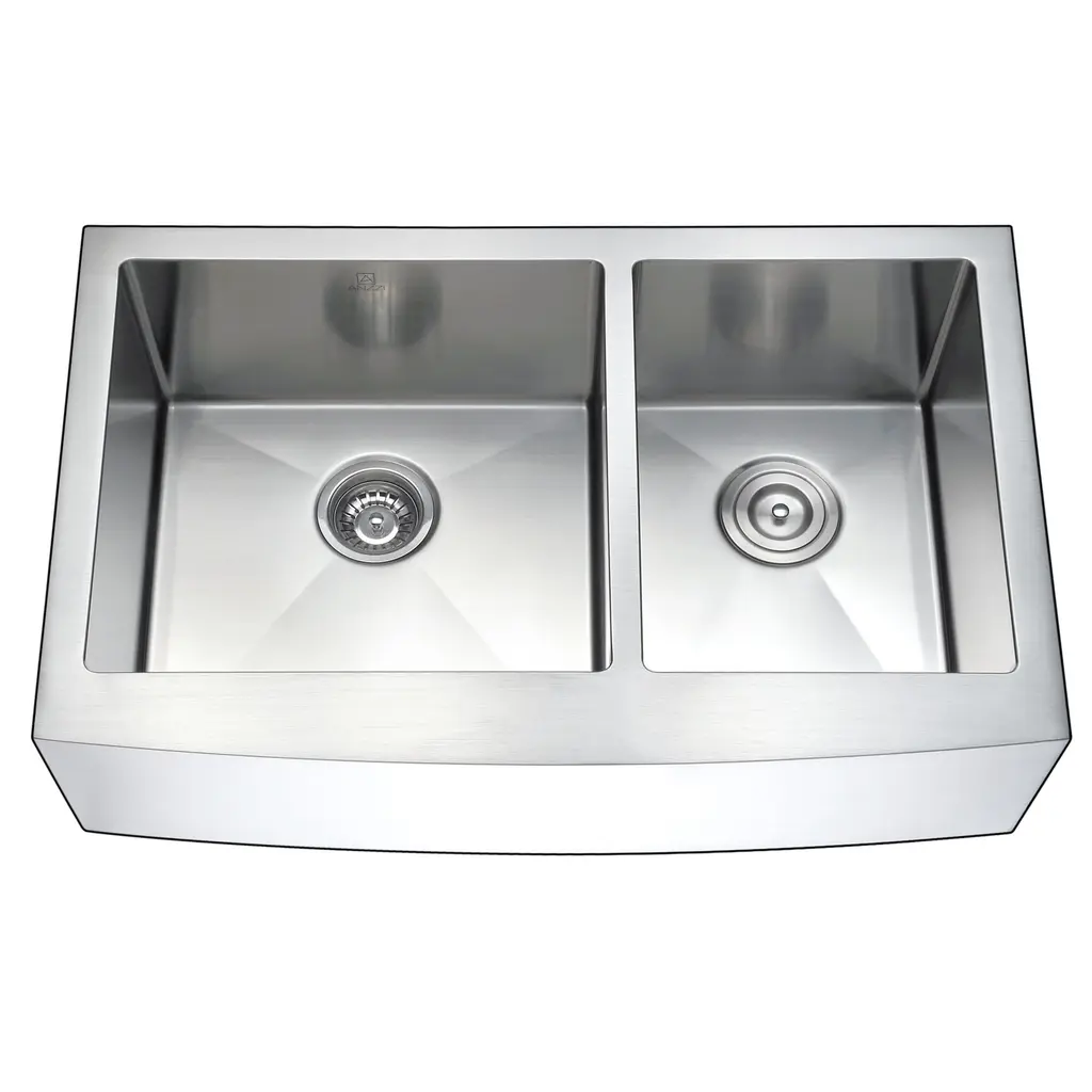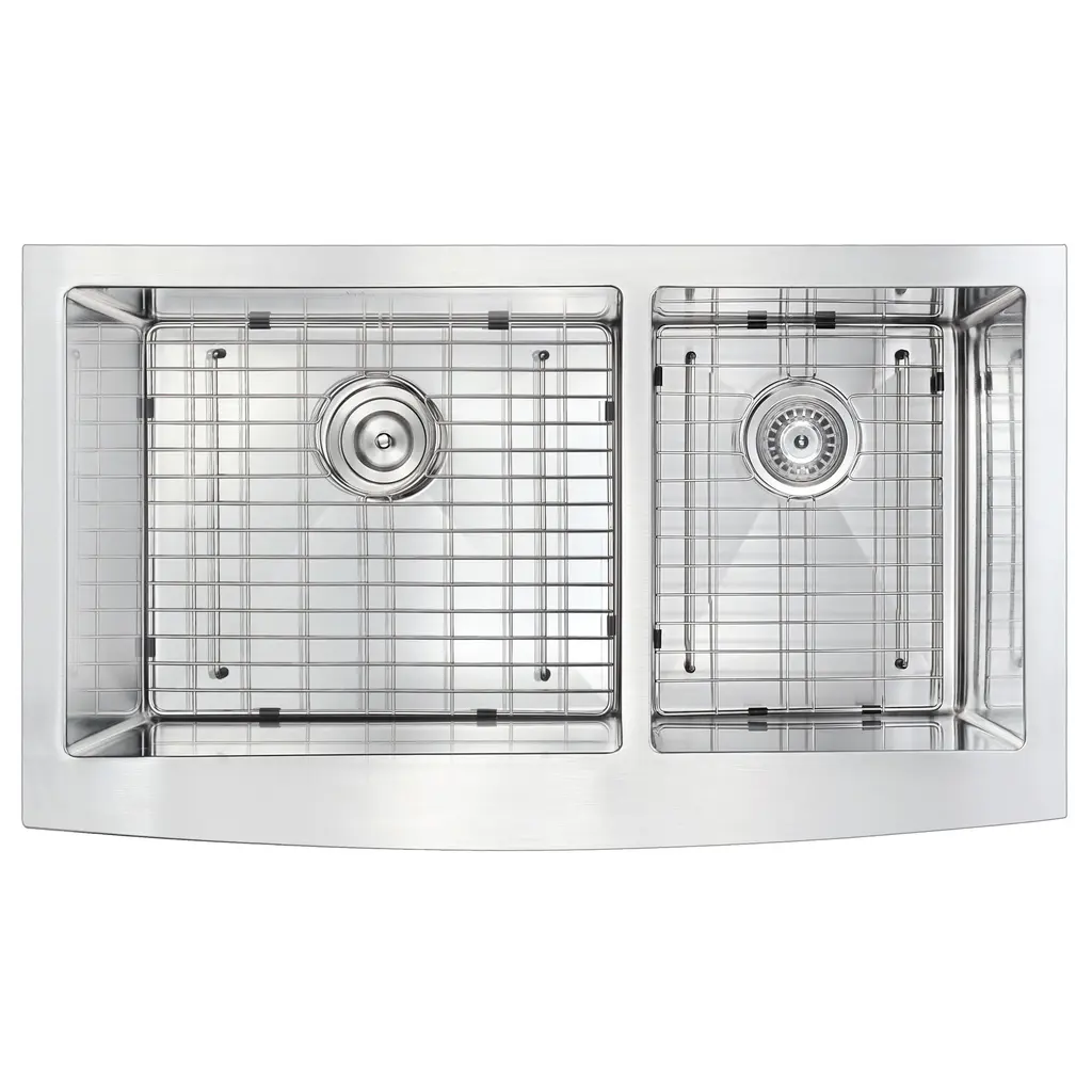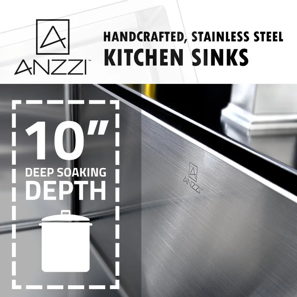 Improve productivity in your kitchen with this spacious double-bowl sink and faucet set. This Anzzi sink features hand-crafted European design and high-quality stainless steel, creating a beautiful look that lasts for years. Elysian series kitchen faucet set Includes perfect fitting strainer and drain assembly, insert strainer basket, mounting hardwareHandcrafted farmhouse sink Cavernous 60/40 deep soaking dual basin Bottom grid Laser precise diverting lines Single handle faucet Pull out faucet style 304, 18 gauge stainless steel material UPC Certified Rhino alloy certified material Assembled Satin finish Silver color Standard 3.5-inch drain opening 36-inch minimum cabinet space 10-inch basin depth Overall: 35.875 inches long x 20.75 inches wide x 10 inches high