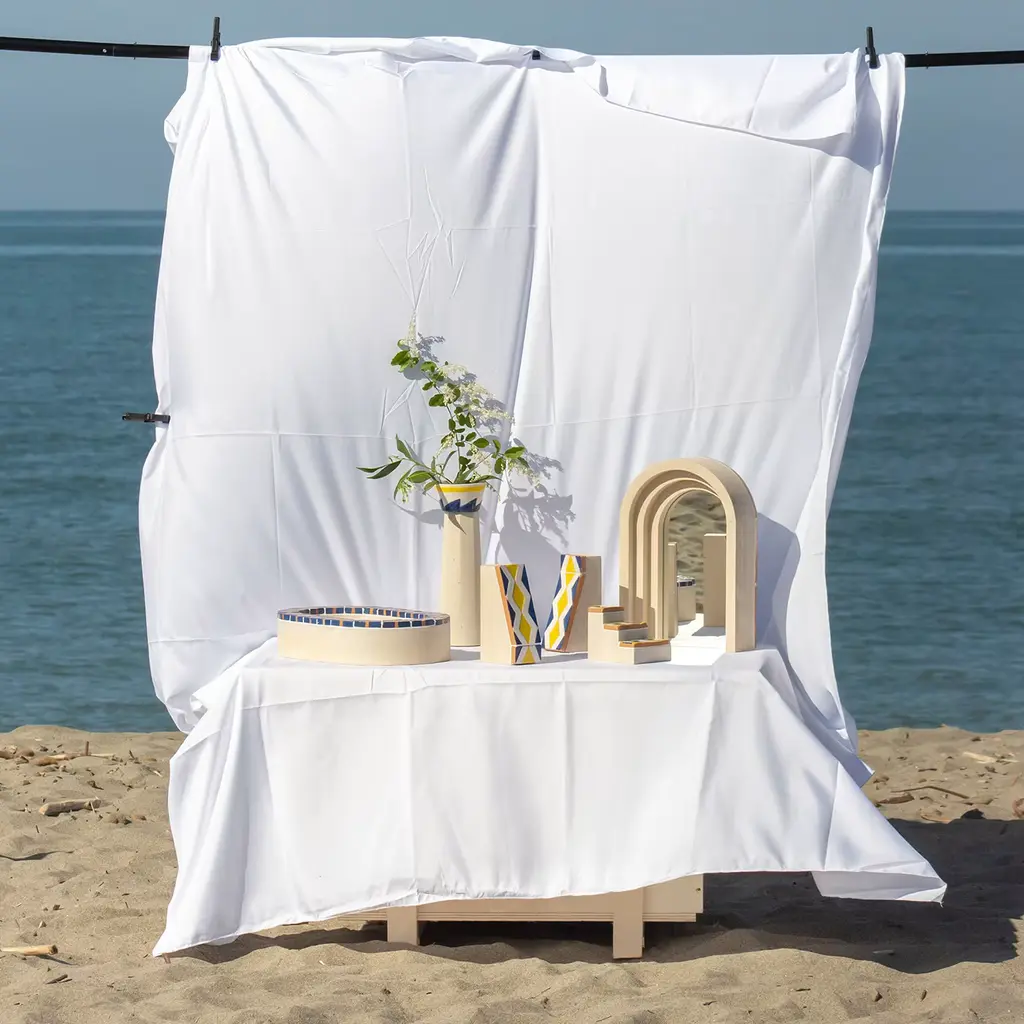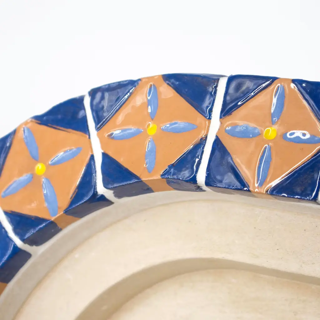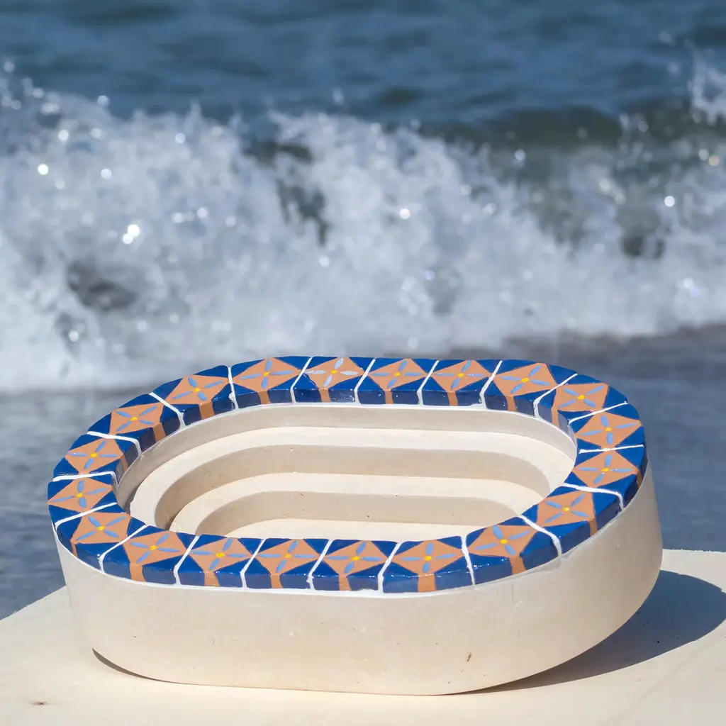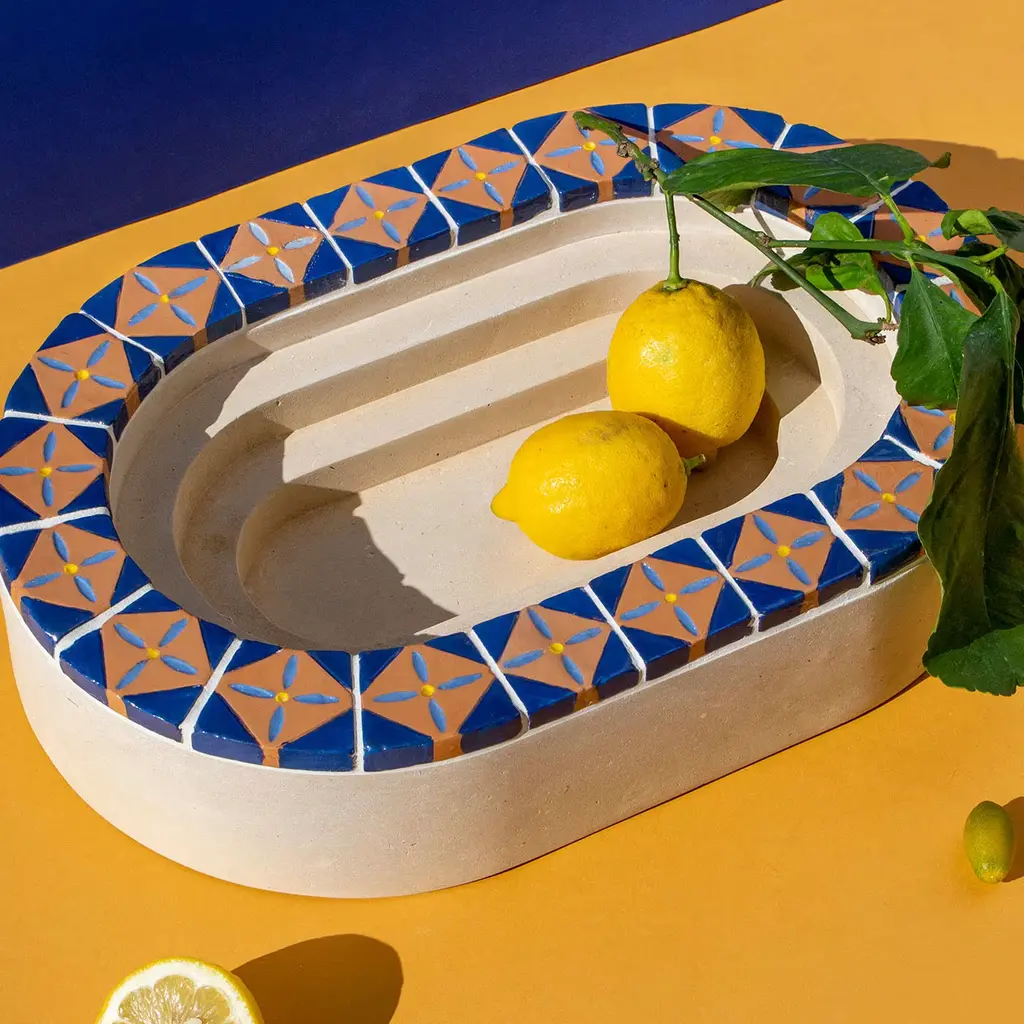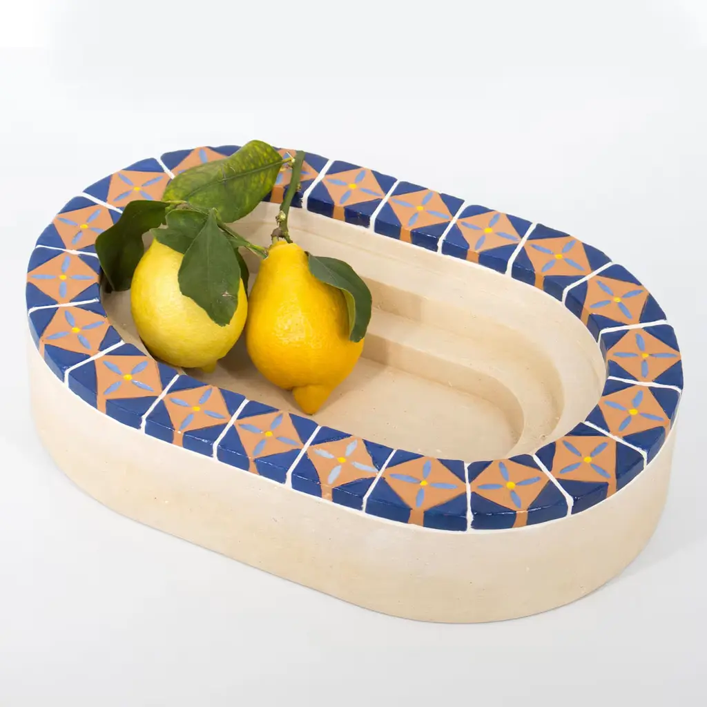 Characterized by the shape of an amphitheater, this fruit bowl belongs to the Apollineo Collection of sculptural design accessories inspired by Mediterranean architecture. The elliptical shape with a concentric, tiered interior is made of Lecce stone, a limestone rich in plant and animal fossils sourced exclusively in Apulian quarries, which is cut using CNC technology and hand-finished to give the look of an ancient stone marked by time. Glazed majolica tiles hand-painted with geometric patterns in bright colors embellish the top border, enhancing its classical reference.