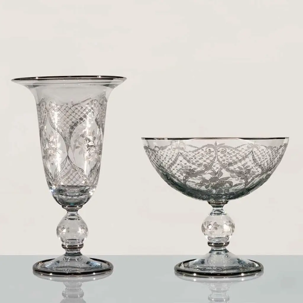 For more than a century, Vetrerie di Empoli has successfully created elegant and sophisticated glassware since its naissance in 1900. This illustrious business is still family owned, providing a vast range of luxury glassware, from classically gilded champagne flutes and stemware to the rainbow-hued Aqua. No matter the style, the Vetrerie di Empoli expertise runs through each exception piece. From its flagship location on via di Montenapoleone, the Milanese elite, along with many international clients, return year after year for precious wedding gifts and priceless family heirlooms.The inlays of our glass, engraved by skilled craftsmen with the stone grinding technique and subsequently embellished with gold or platinum fixed at high temperature, are freely inspired by the rich embroidery of baroque clothing; as evidenced by the painting of the noble character immortalized by the Lombard painter Fra Galgario around 1715, now preserved in the Pinacoteca di Brera in Milan.