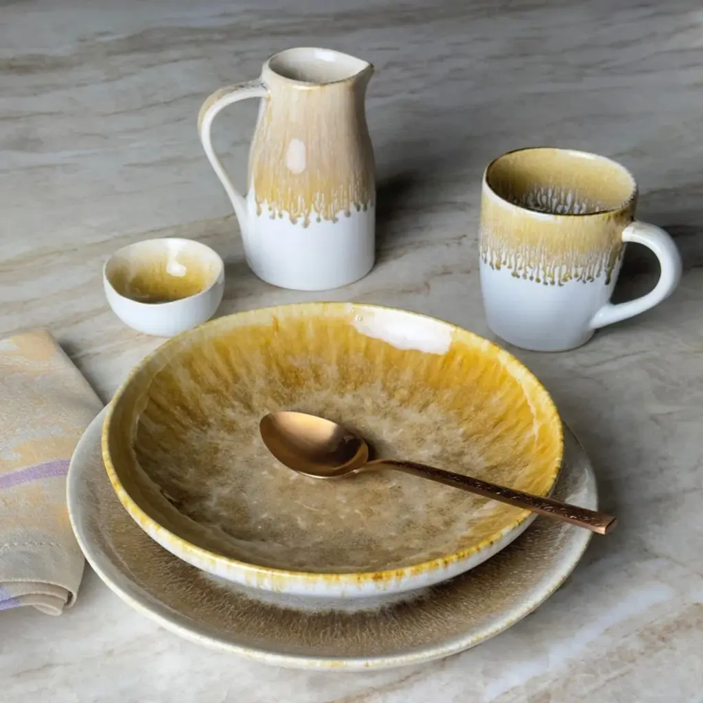 The Arturo collection brings stylish appeal to everyday dining. Different shades of brown mix with the white background in endless combinations. The reactive glaze makes each piece unique. The low bowl/pasta bowl may be used in place of a salad plate or along with a traditional place setting. 9" diameter and about 2" deep. Microwave and dishwasher-safe ceramic stoneware. Made in Portugal.