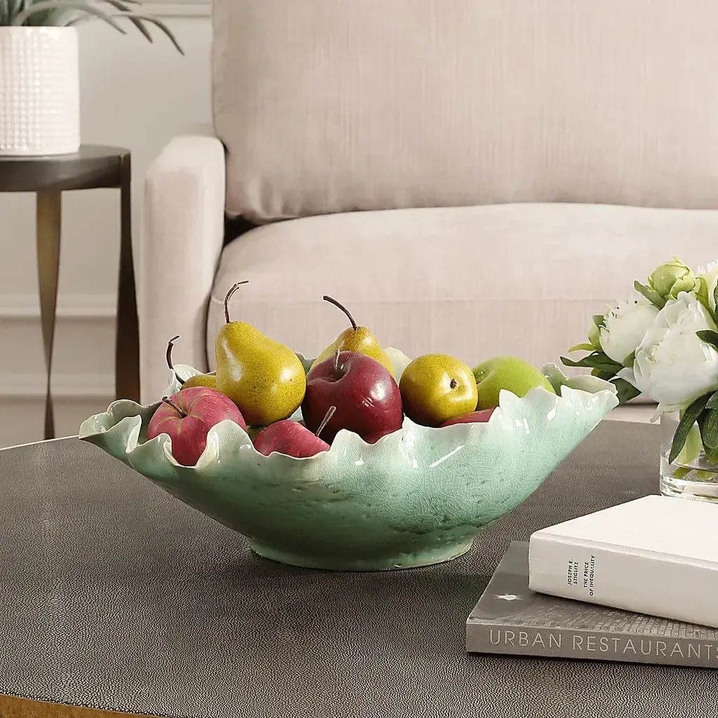 This elegant Benkai ceramic bowl features a stunning ruffled edge design, evoking the delicate shape of a blooming flower. Its soft green glaze with a subtle crackle finish adds texture and sophistication, making it an ideal statement piece for any modern or classic decor.