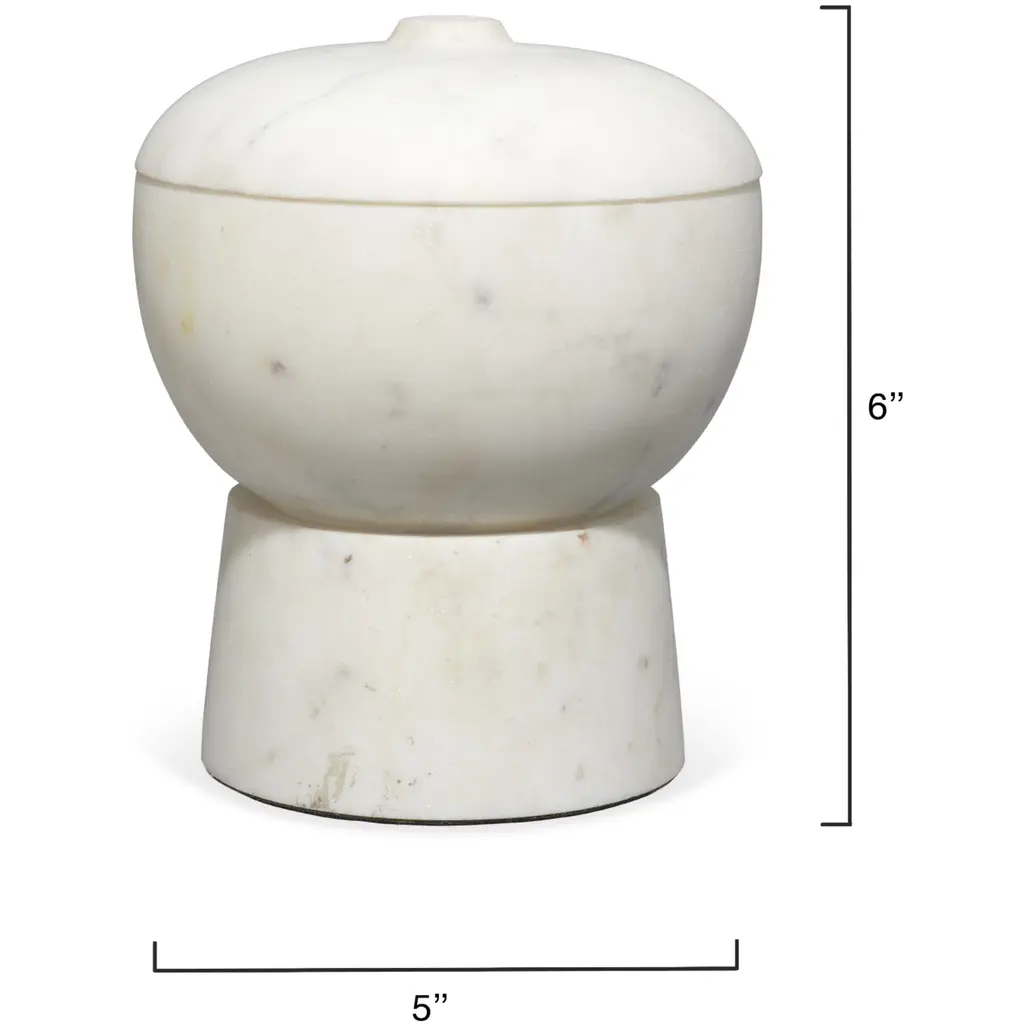A softly rounded, lidded bowl is placed on top of a pillar base to create some seriously chic storage! These expertly crafted marble containers celebrate the beauty of the natural stone from which they are carved, and no two will be identical. Use with cotton balls in the bath, jewelry in your dressing area, or fill with potpourri to beautify and gently scent your entry.